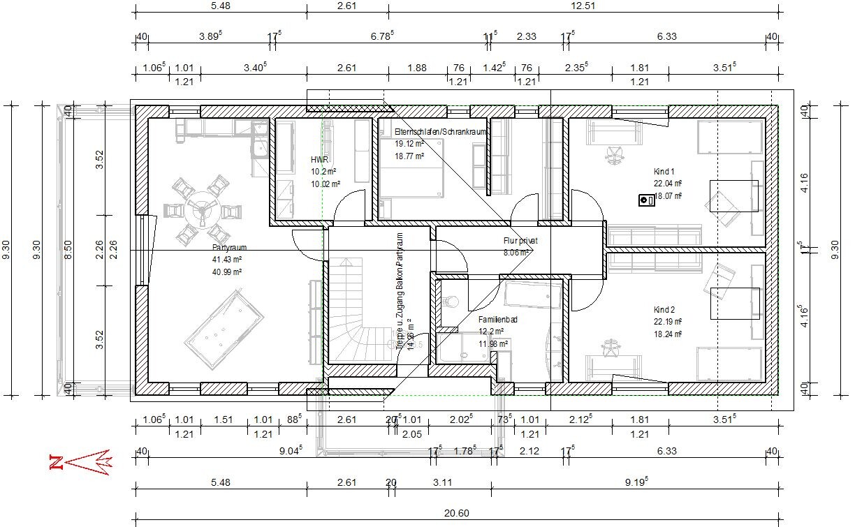 Damals hatte ich auch immer den Wunsch geäußert, dass ich vom Flur aus in jeden Raum (also auch Küche) direkt gehen kann, ohne durch das Wohnzimmer zu müssen.Und welchen Mehrwert hättest Du dann? Bei diesem Entwurf ohne Defizite nicht machbar. Ich würde allerdings den Durchgang Küche/Ess nach vorne rücken und die Einrichtung ändern. Aber das sind Kleinigkeiten - das Gerüst muss stehen.