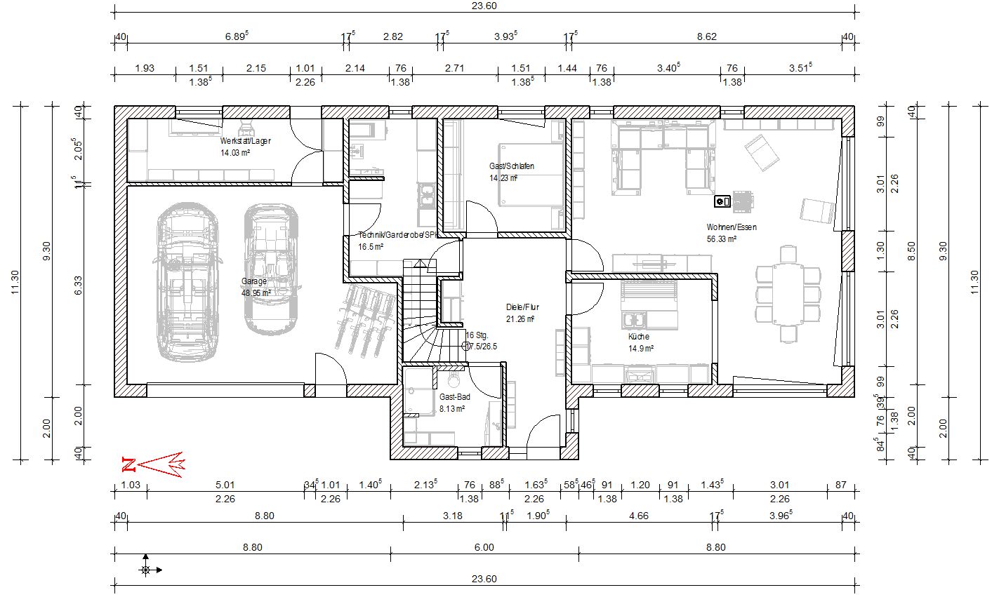 Eine Frage noch mal zur neuen Treppe in der Garage. Da hat du unter dIe Treppe eine Tür gemacht zum WC. Darf die da sein, weil es eh nur Garage und kleines WC ist, oder würde die diese Konstellation auch im Haus nicht weh tun. Weil ich Frage mich immer, wie das aussieht, wenn eine Tür über der Treppe ist. Hatte das nämlich auch schon mal in einen Entwurf.Grundsätzlich kannste das halten wie Du willst. Ich persönlich mag keine Türen unter Treppen. Im Wohnbereich würde ich das nicht planen. Aber in der Abstellkammer für ein Gäste-WC find ich das nicht so dramatisch. Schlimmsten Falls musst Du diesen 2. Eingangsbereich eben noch verbreitern, damit die Treppe neben der Tür aufhört. Find ich aber Platzverschwendung.Slammer0909 schrieb: