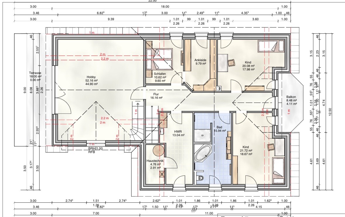 So nun der Knackpunkt an Version "Treppe barseitig": Kommt das oben noch hin mit den Dachschrägen für den Waschraum? Evtl ist der zu weit an die Wand gerückt und man kann ihn gar nicht vernünftig betreten..