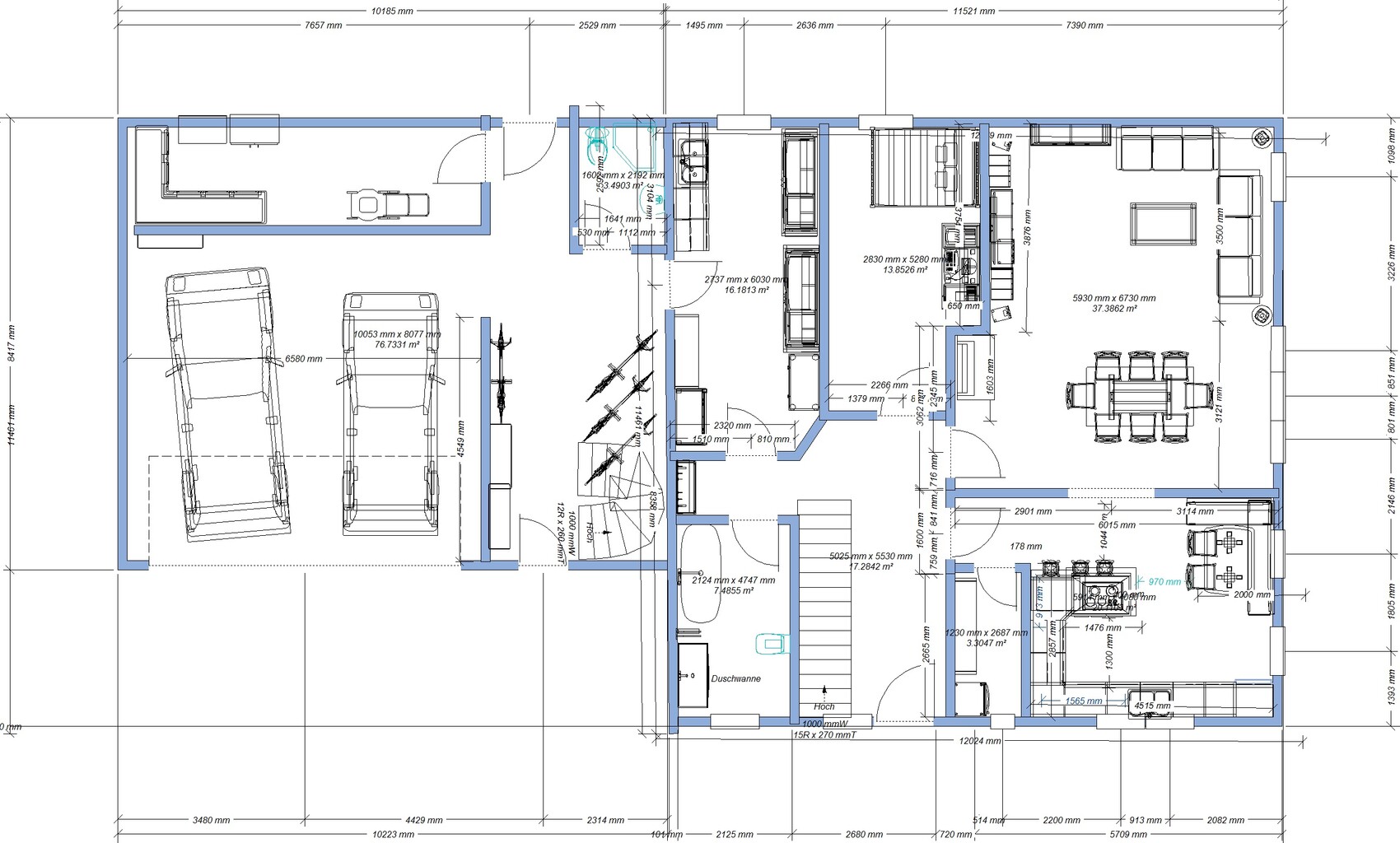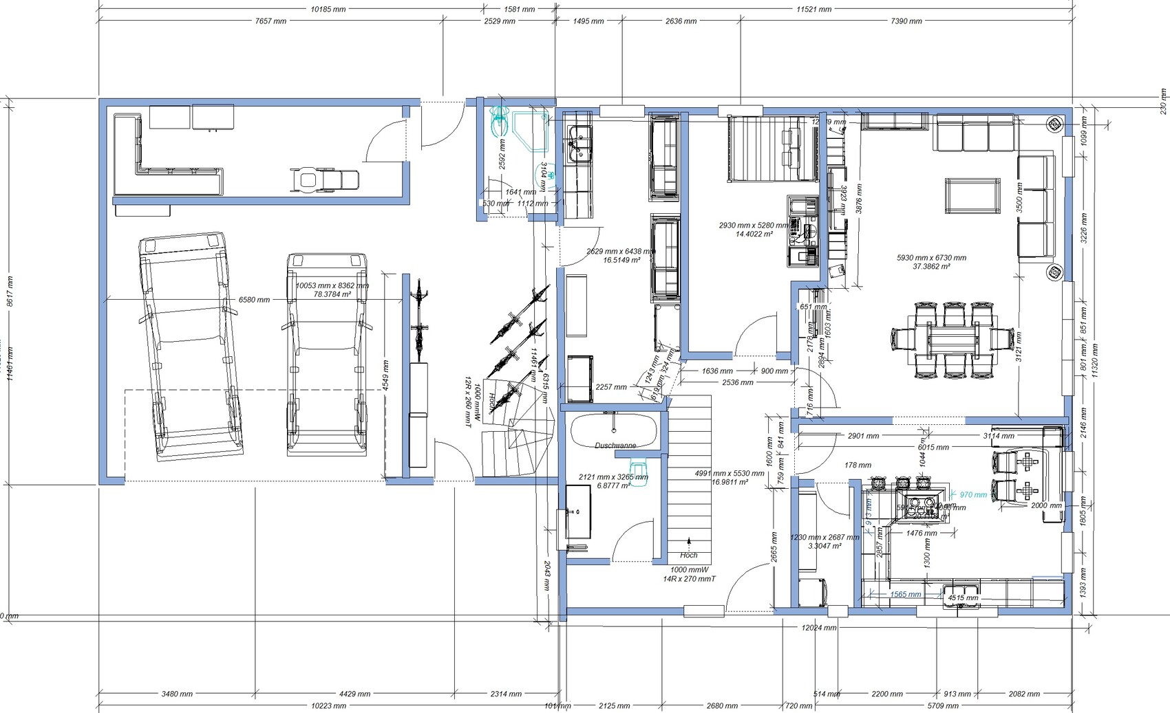 Der Weg von Garage über Technik-Raum ins Haus ... na, da kann man sich den Zugang über die Garage auch sparen. Das ist eine Lauferei um Ecken etc.