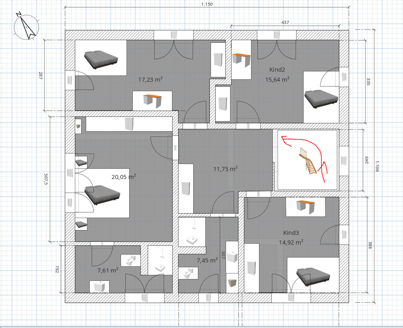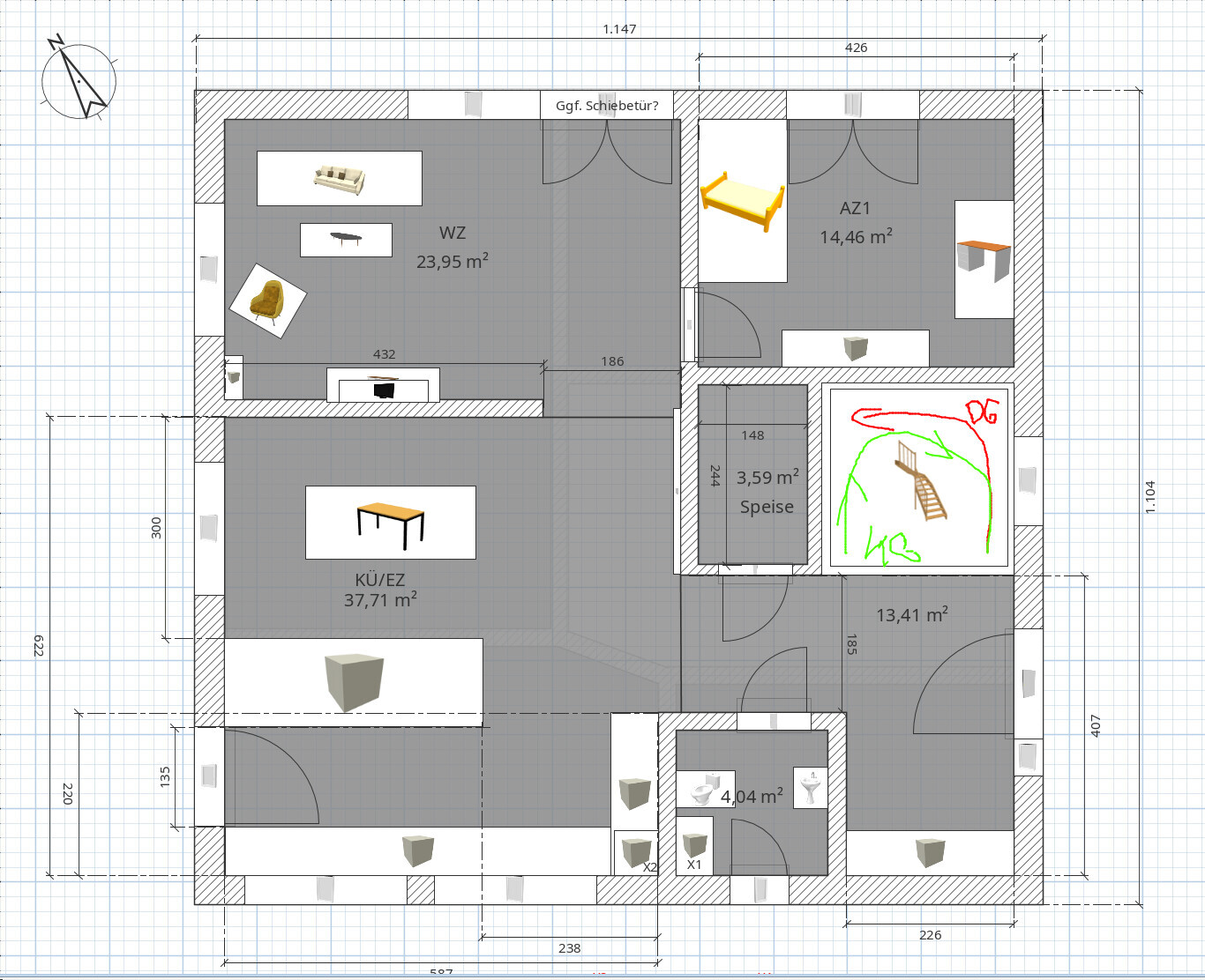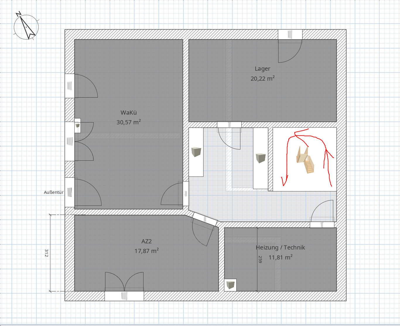 Für die Treppe habe ich nochmal die Laufrichtung eingezeichnet. Hoffe so wird es klarer