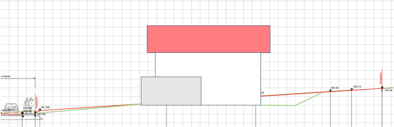Unser Haus wird in den Hang reingebaut und sitzt tiefer im Gelände = weniger Sonnenlicht. EG und Garagenniveau sollen ja immerhin auf einer Ebene liegen. Folgend wäre das Gartenniveau auch ungefähr auf dieser Ebene. Im hinteren Bereich des Baufeldes müsste die Gartenfläche mehrmals abgestuft werden, um den Höhenunterschied von fast 3m auszugleichen. (Wasser soll ja nicht zum Gebäude fliesen bei Regenereignissen)