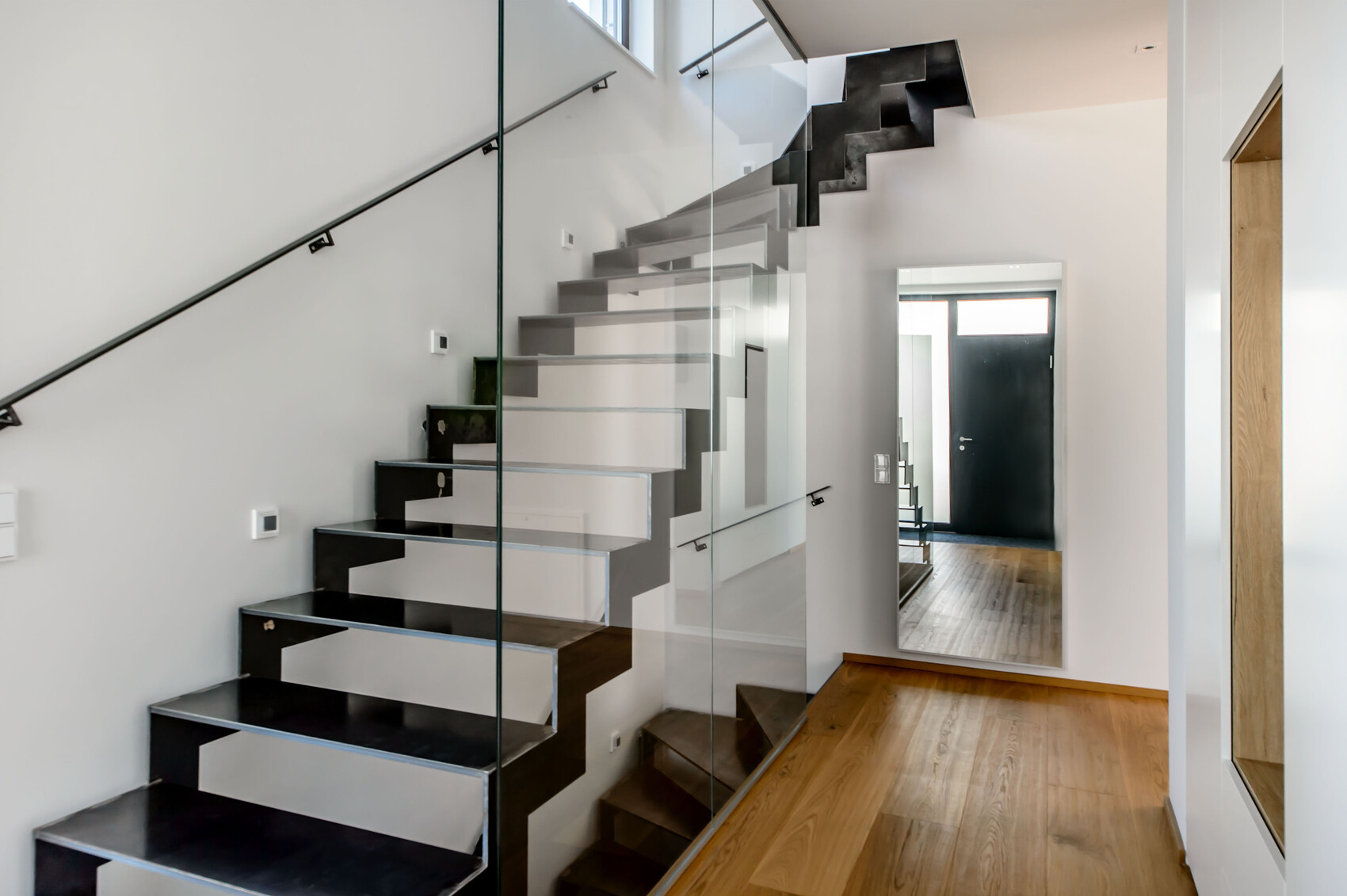 @Würfel: Könntest du ein Foto davon reinstellen? Danke!Hier ein Bild von meiner Treppe mit Glaswand. Mussten 2 Teile sein, sonst wäre es zu unhandlich geworden. Wir haben 280 cm Raumhöhe. Die Rohstahltreppe ist sicher nicht Jedermanns Sache, aber ich finde den Style cool 🙂