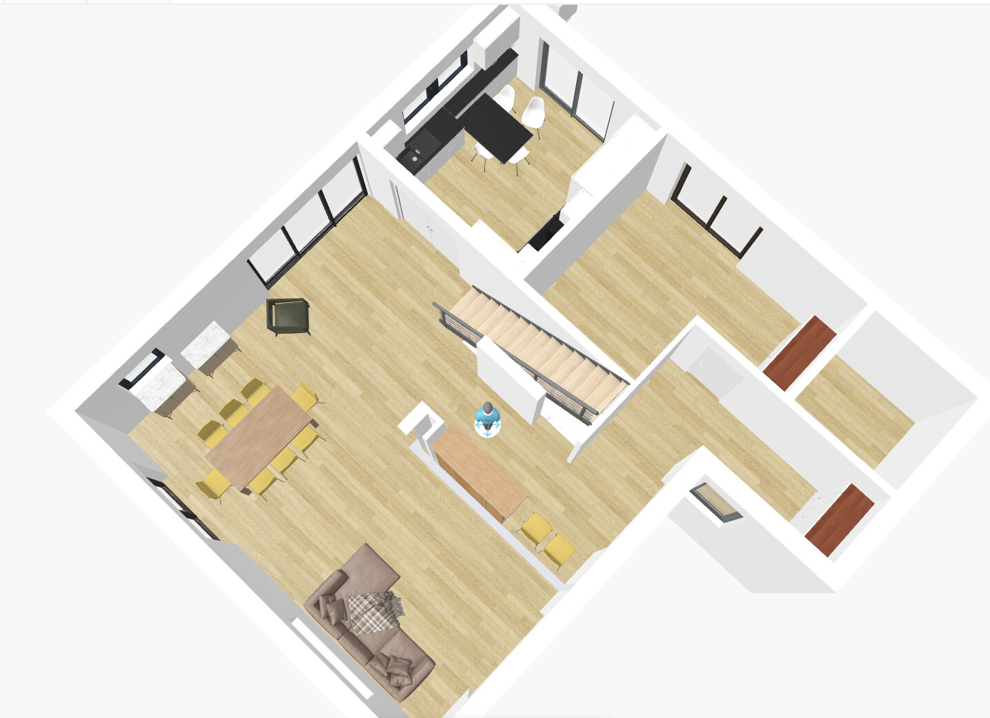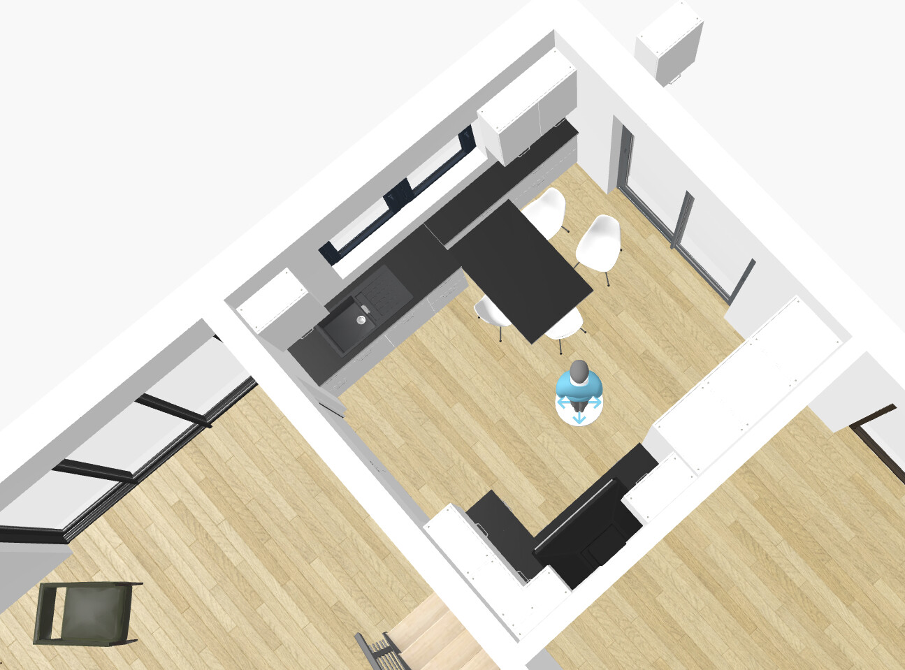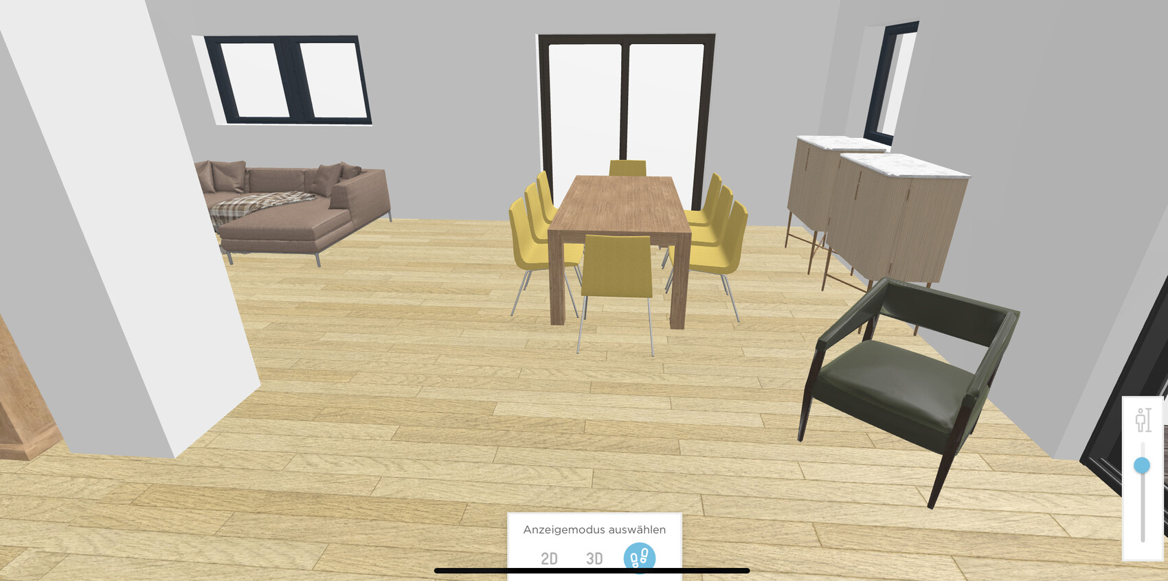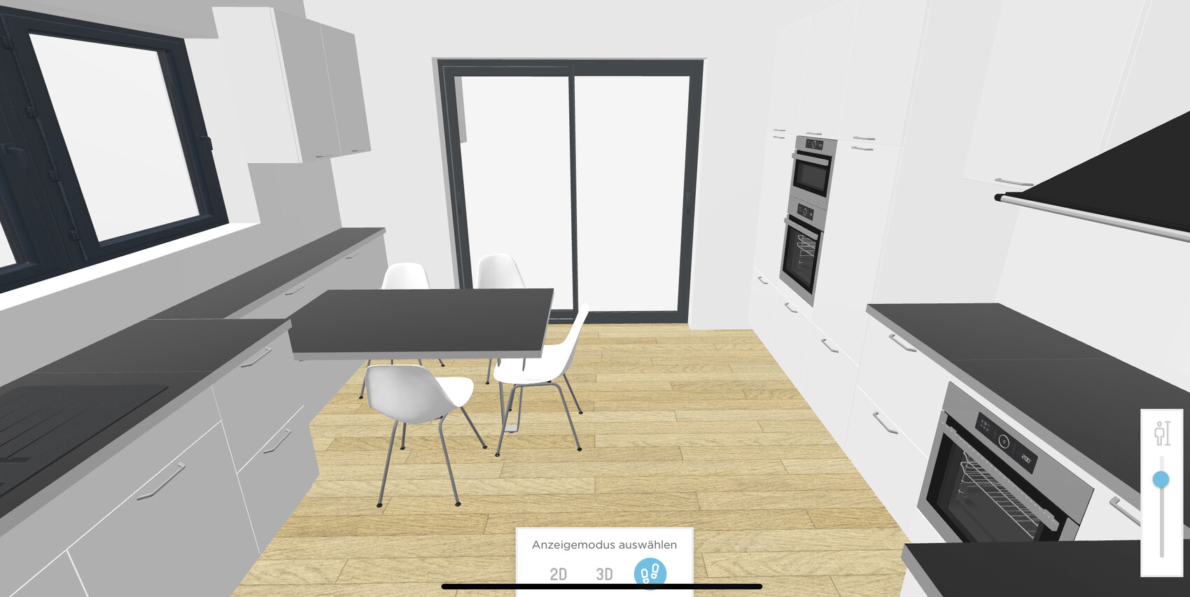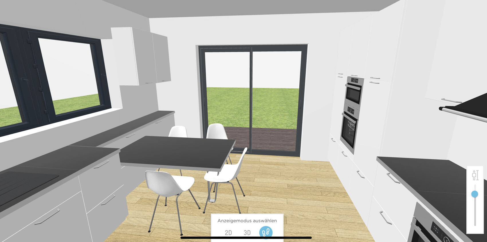 Als Schiebetür zur Küche habe ich geschlossen gewählt, auch der Treppe eine Wandscheibe statt Glas gegeben, weil man bei viel Glas und Offenheit auch mal etwas Wand und Tür braucht (obwohl es bei Würfel klasse aussieht).