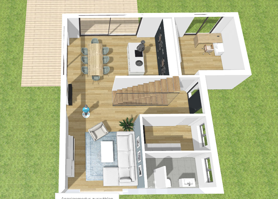 Habe am verregneten Wochenende mal wieder Homebyme ausprobiert. , bei mir funktioniert alles einwandfrei! Anbei mal eine Idee, wenn du das EG später einfach nur mal für dich nutzen willst und keine richtige Einliegerwohnung brauchst. Küche zum Garten hin, Büro ebenso. Großer Esstisch passt auch rein und du bekommst Licht von Süden. Inkl. verglaster Treppe. Leider kann das Programm kein Dach, oder ich checke es nicht. Insofern siehts aus wie ein Flachdachhaus 😉