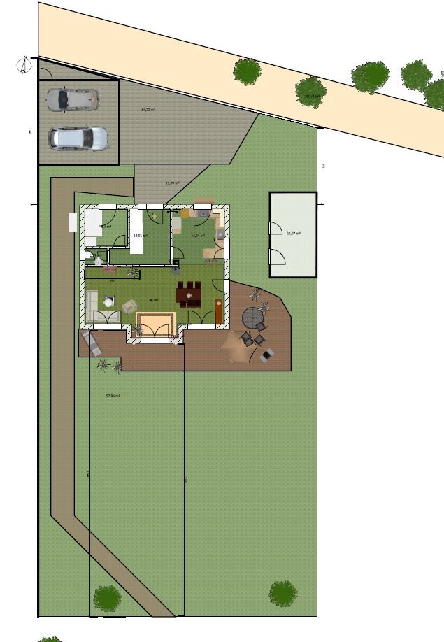 Im Anhang noch eine Skizze vom Haus auf unserem Grundstück, dem Schuppen, Carport und anskizzierter Terrasse.