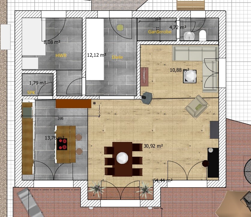 seufz, dennoch sind die Maße sicher sehr wichtig, wenn es um Platz vor den Terrassentüren geht, um der Insel, um den Esstisch und den Bereich der Garderobe/Schlafzimmerschrank.