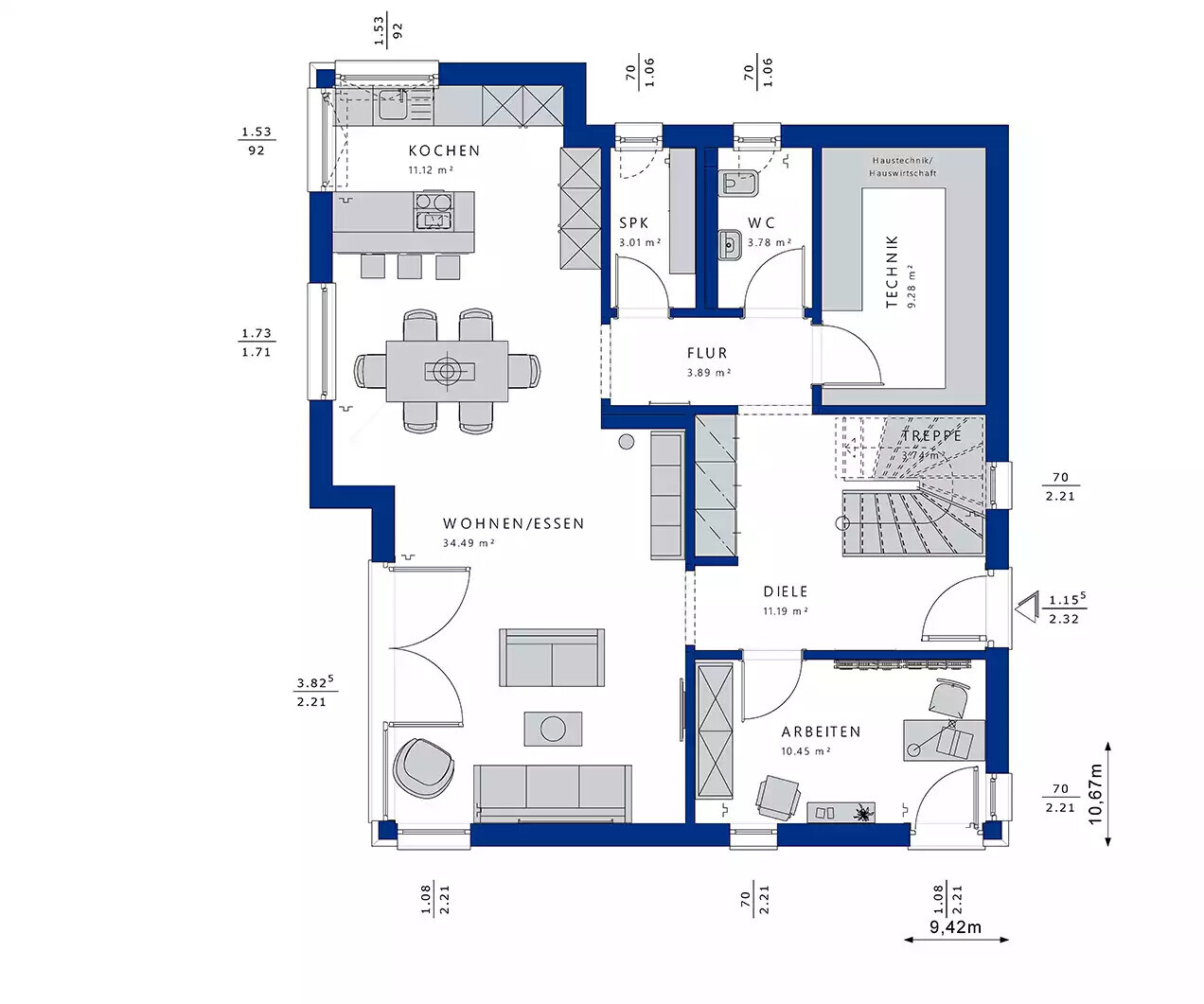 Bei Nähe Garage/Eingang auf einen Zweitflur durch den rein (im Sinne von sauber) zu haltenden Hauswirtschaftsraum verzichten. Hauswirtschaftsraum und Speis zusammenlegen. Das funktioniert. Oder Hauswirtschaftsraum in den gewonnenen Qm im DG unterbringen. Letzendlich sollen auch Qm eingespart werden. WZ ist zu groß. Naja, das kann man schon zurechtzuppeln. Die gewachsene Tiefe des Hauses kann man unter Dach besser nutzen. Aber stauchen muss man wohl das ein oder andere.Danke für den Vorschlag. Ich habe jedoch dein Eindruck dass man auf der Terrasse dann etwas eingeengt zwischen Nachbarhecke (welche direkt auf der Grundstücksgrenze beginnt) und eigener Hauswand ist. Wenn es zudem nicht gerade Hochsommer ist und die Sonne etwas tiefer steht, könnte ich mir vorstellen, dass der Schattenwurf des Nachbargebaeudes und durch die Hecke nur wenige Meter Sonne übrig lässt. Die Hecke ist ca 1,50m hoch und wäre ca 3m vom Haus entfernt, wenn dieses nicht schmaler wirdÄhnliche Themen