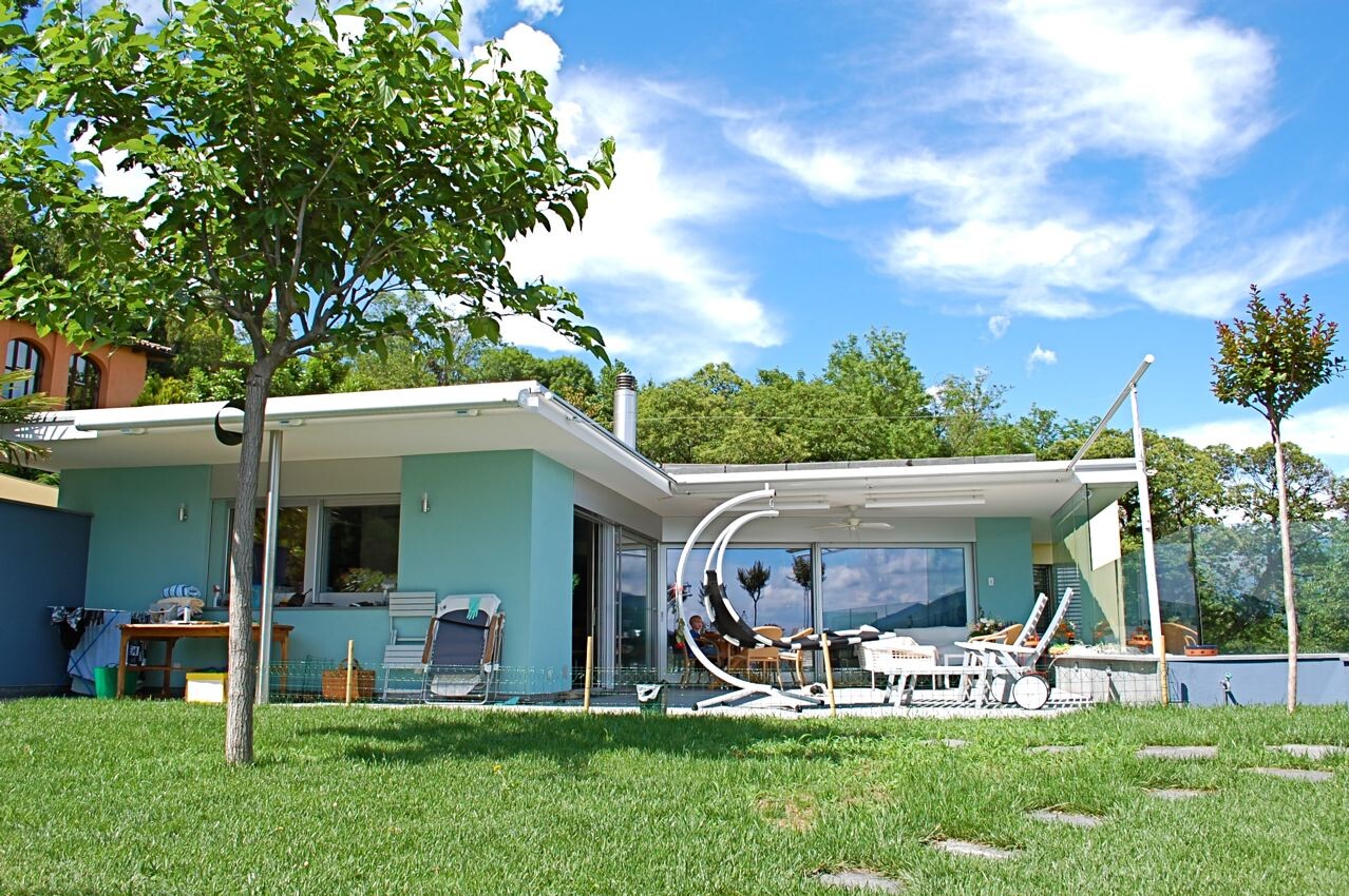 Die Hausecke linksvorne ist die Küche, daran schliesst sich das Esszimmer an, rechts das Wo-Zi, dahinter im gelben Hausteil befindet sich das Schlafzimmer. Die Terrassenüberdachung ist ca 3m - daran anschliessend ein 5x5m Bereich den wir mit einer Markise überdachen können.