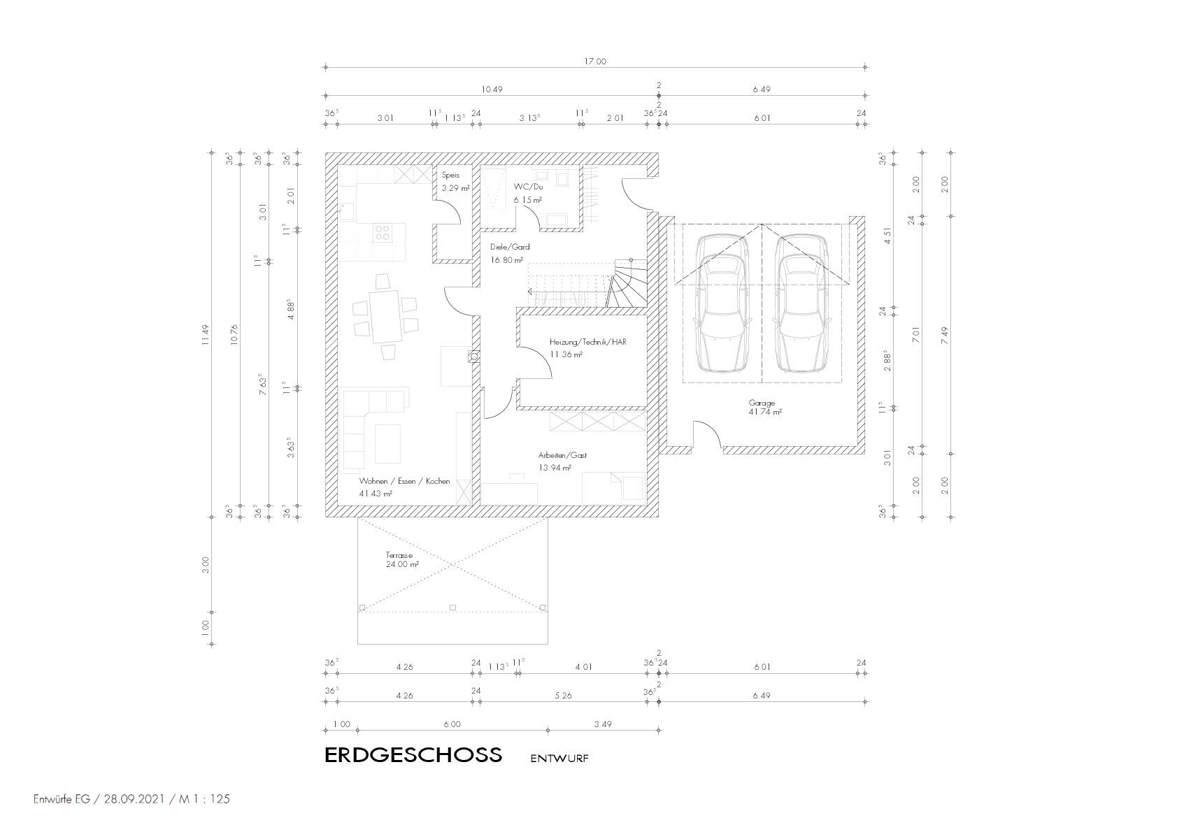 Im Esszimmer dann einen runden Tisch für 6, im WZ das Sofa etwas kleiner und da sollten schonmal 80cm in der Tiefe eingespart sein, 100 cm wären wohl auch noch drinnen. Das Gästezimmer (Bett um 90 °drehen) und Technik jeweils um 50 cm kürzen (in Mauer eingelassene Schiebetür wäre nett).