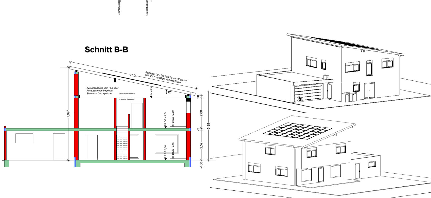 Standardentwurf vom Planer? "Verbesserung" eines Plans eines Mitbewerbers. Pultdach ist inzwischen schon Standardentwurf des Planers