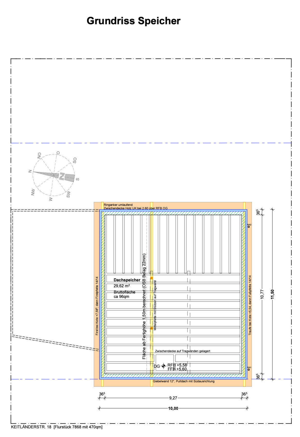 Grundriss eines Dachspeichers mit Maßen und Kompassdarstellung.