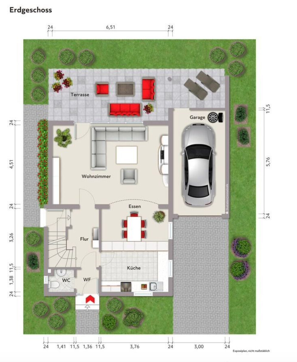 Wenn das gezeigte Bild auch das Grundstück abbildet, wird es mit der Aufstockung auf der Garage schon schwieriger wegen der Grenzabstände.