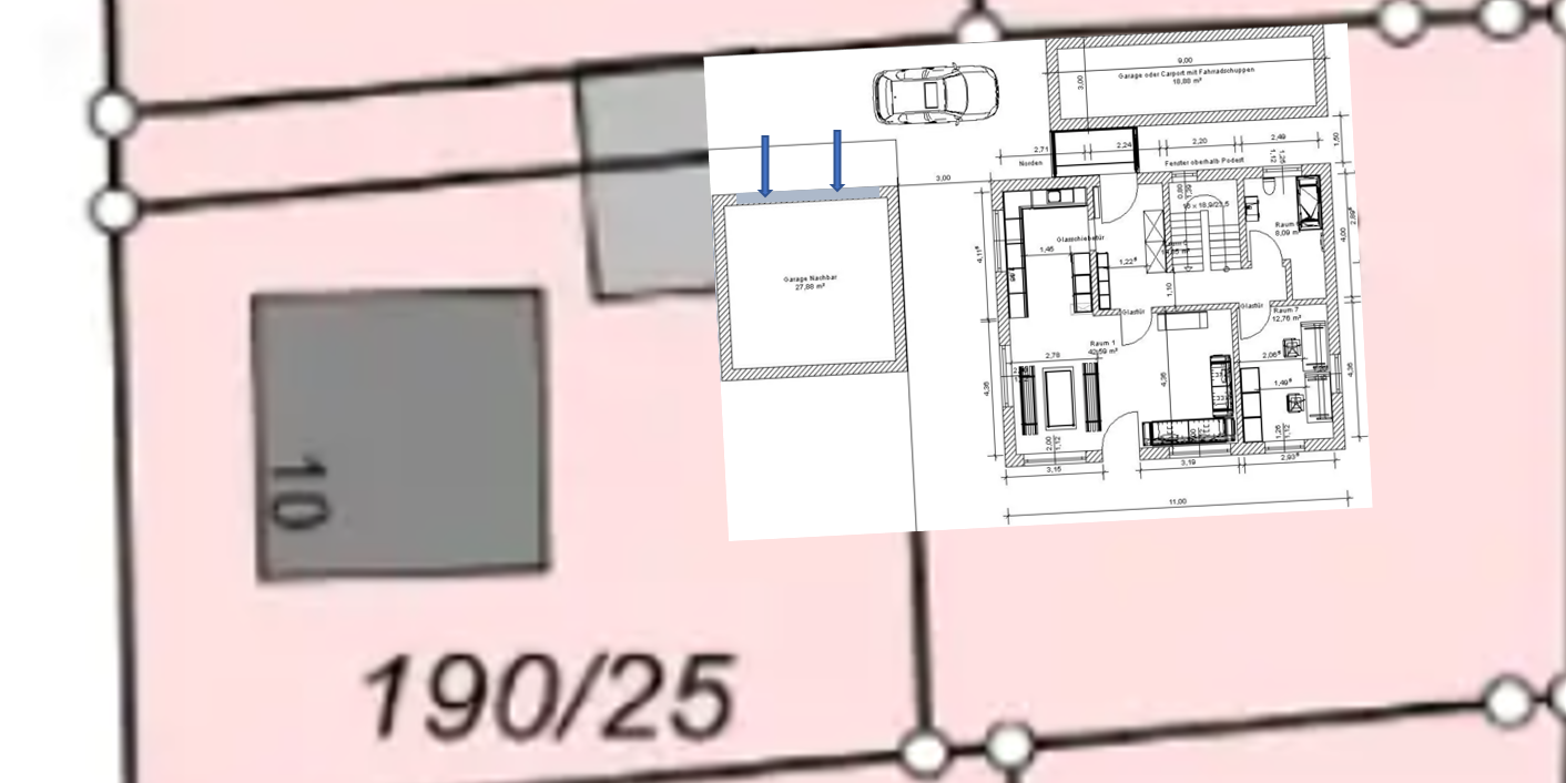 Die Garage möchte er nicht maximal nach Norden schieben um etwaige Beschädigungen oder ähnliches durch uns zu vermeiden. Daher der 1m oder mehr Abstand von seiner nördlichen Grenze. Alles derzeit nur Überlegungen, noch nichts davon ausgeführt.