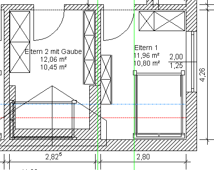 Glaub es wurde schon gesagt: Der kleine Raum, also Eltern 2 soll eine Gaube bekommen und der Raum kriegt noch 30cm mehr von Eltern 1. Die werden nicht gebraucht, wenn da ein 1,5m schrank hinkommt. Also irgendwie so, wobei die Wände bei der Gaube natürlich ohne Vorsprung wären etc. Riesig ist es nicht, aber muss es auch nicht sein. Es wird geschlafen und sich angezogen und in spätestens 20 Jahren gehören die großen Zimmer uns 🙂