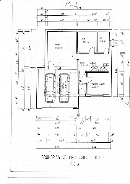 2-Auto-Garage im Kellergrundriss mit Treppenhaus und Nebenräumen