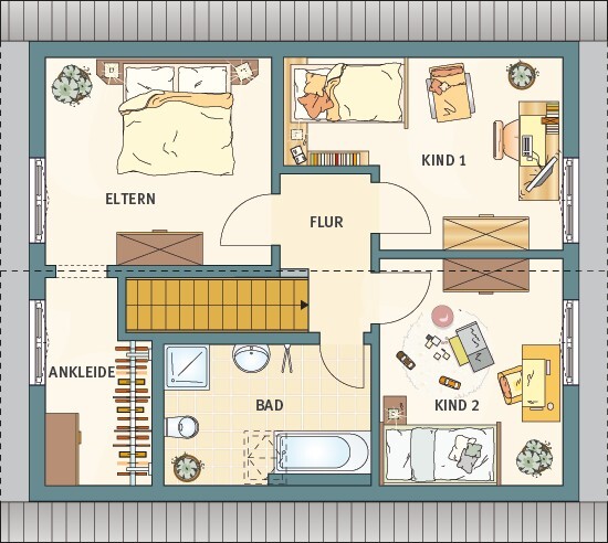 Ich finde den Grundriss jetzt gar nicht so schlecht: klar, das Gästezimmer sowie das Kinderzimmer sind zu schmal, die Mauer zwischen Wohn und Küche macht Küche klein und bringt einen unnützen Verkehrsweg. Küche wäre auch von der Möblierung her zu klein: kaum Schränke, wenig Arbeitsfläche. Garderobe finde ich sehr klein für 4 Personen (auch für 3 😉), Süden sind nach meinem Geschmack zu wenig Fenster mit dem einen. Im OG könnte man den Platz des Schrankes im Schlafzimmer der Ankleide zuordnen: Schlafzimmer reicht dann immer noch, Ankleide hätte viel Schrankfläche. Badeinrichtung gefällt mir auch nicht: Badewanne hat einen gemütlicheren Platz verdient, weiter hinten. Dusche steht auch im Weg, könnte in den Bereich der Wanne wandern.