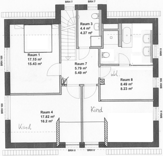 Im Bereich, in dem sich Raum1 derzeit befindet, war im ursprünglichen Entwurf zunächst eine Podesttreppe mit entsprechendem Platzbedarf geplant. Wir haben uns jedoch bewusst gegen eine solche großzügige und damit auch repräsentativere Treppe und für dem "Raum1" entscheiden.Wenn man eine Treppe wegwirft, sollte der Grundriss immer gleich hinterherfliegen. Grundriss und Treppe sind wie Wellensittiche, die sollte man immer als Paar halten ;-)