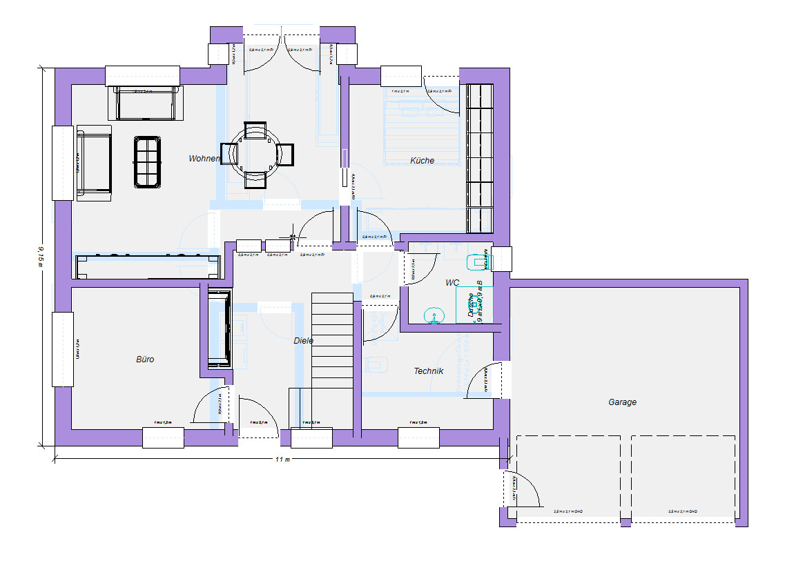 Man wird das Gefühl nicht los, dass man mit 11x9 im Querformat hier nicht so richtig glücklich wird. Haus drehen klingt zwar erst mal verlockend, aber dann verliert man eben die breite Front in den Garten. Andererseits bei der konservativen Abtrennung der Küche, entsteht sowieso kein Gefühl von Großzügigkeit.