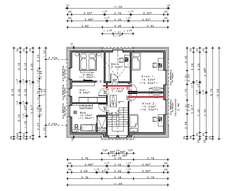 Das ist nun der aktuelle Stand im OG. Rote Linien sollen andeuten, wie wir die Wände noch verschieben wollen, um dem Büro noch ein paar cm zu gönnen.Bei den Schränken würde ich aber auf den bisher zwischen den Kinderzimmern geplanten Wandverlauf zurückschwenken.OWLer schrieb: