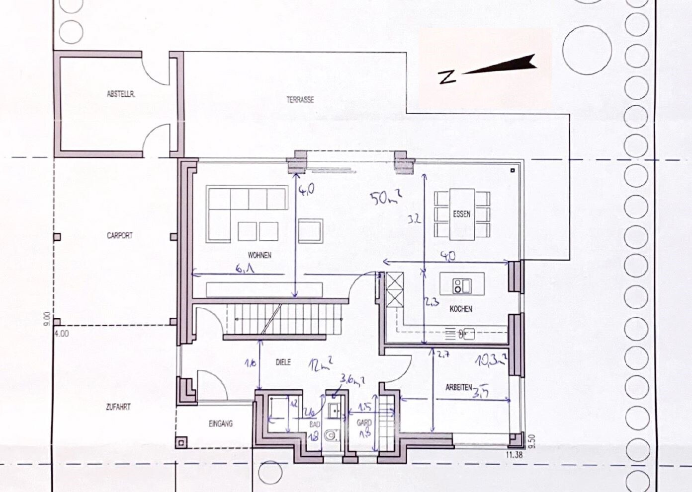 Wart Ihr schon in Musterhäusern? Sowas, was Ihr hier skizziert, gibt es bestimmt irgendwo ähnlich direkt zum anschauen.Ja klar, waren in mehreren Musterparks und auch in den Häusern von GU1 und haben auch mit den Bauherren gesprochen.