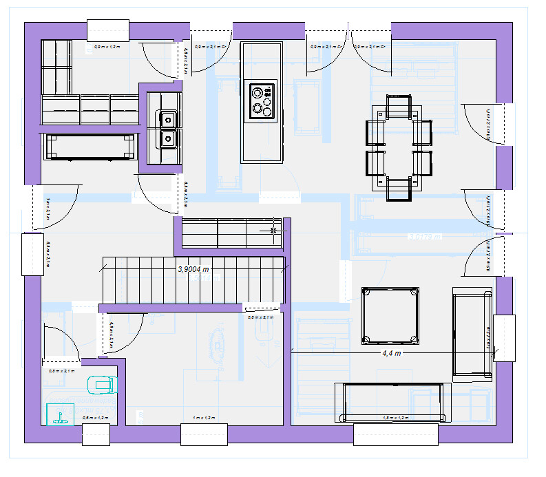 Deswegen hatten wir in unseren Vorstellungen experimentiert mit Schiebetüren oder zumindest etwas eingezogenen Wänden, die den Wohnbereich von der Küche zumindest etwas abtrennen. Sozusagen teiloffen..