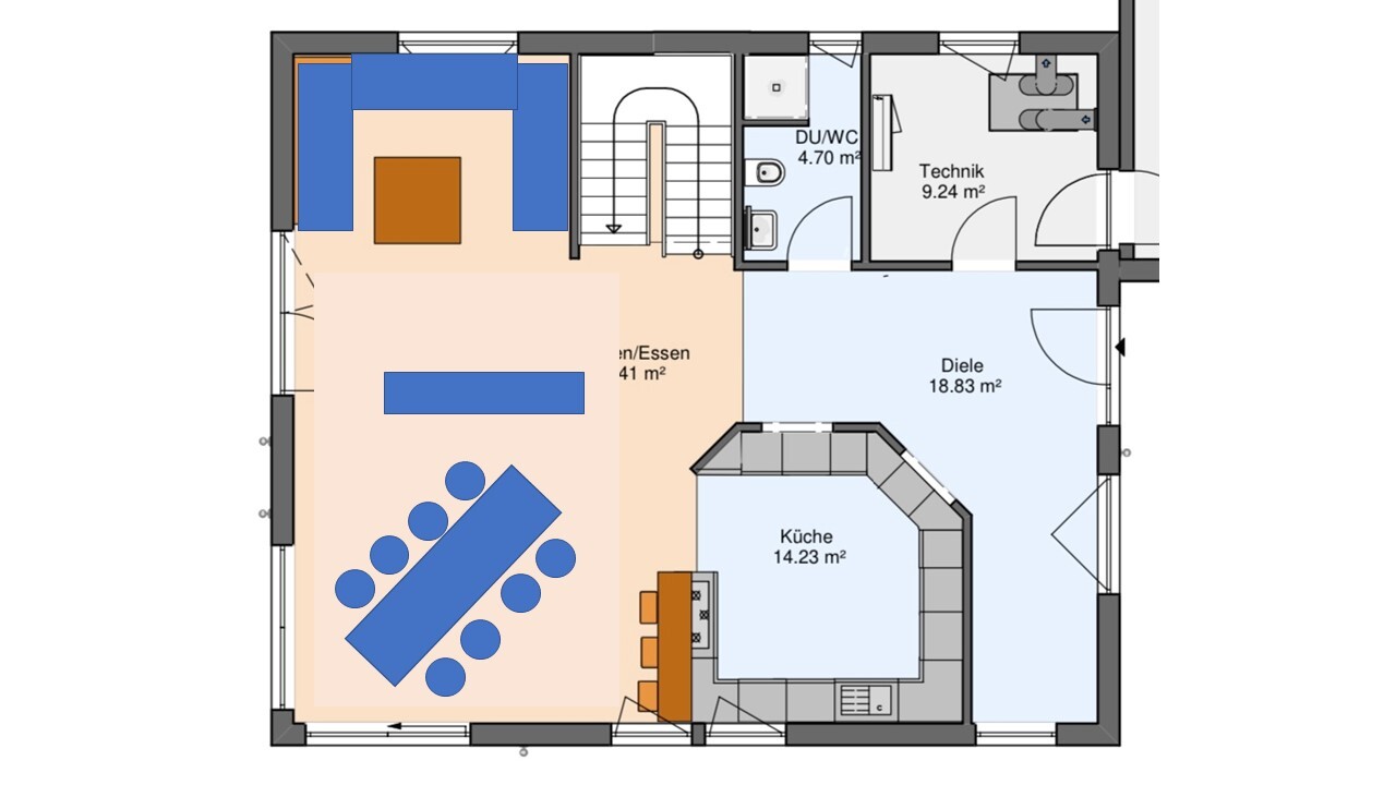 Anhand der Treppenstufen scheint mir die Deckenhöhe im Verhältnis zur Raumfläche viel zu niedrig. Das gibt schnell eine drückende große Fläche und die Großzügigkeit ist dahin.