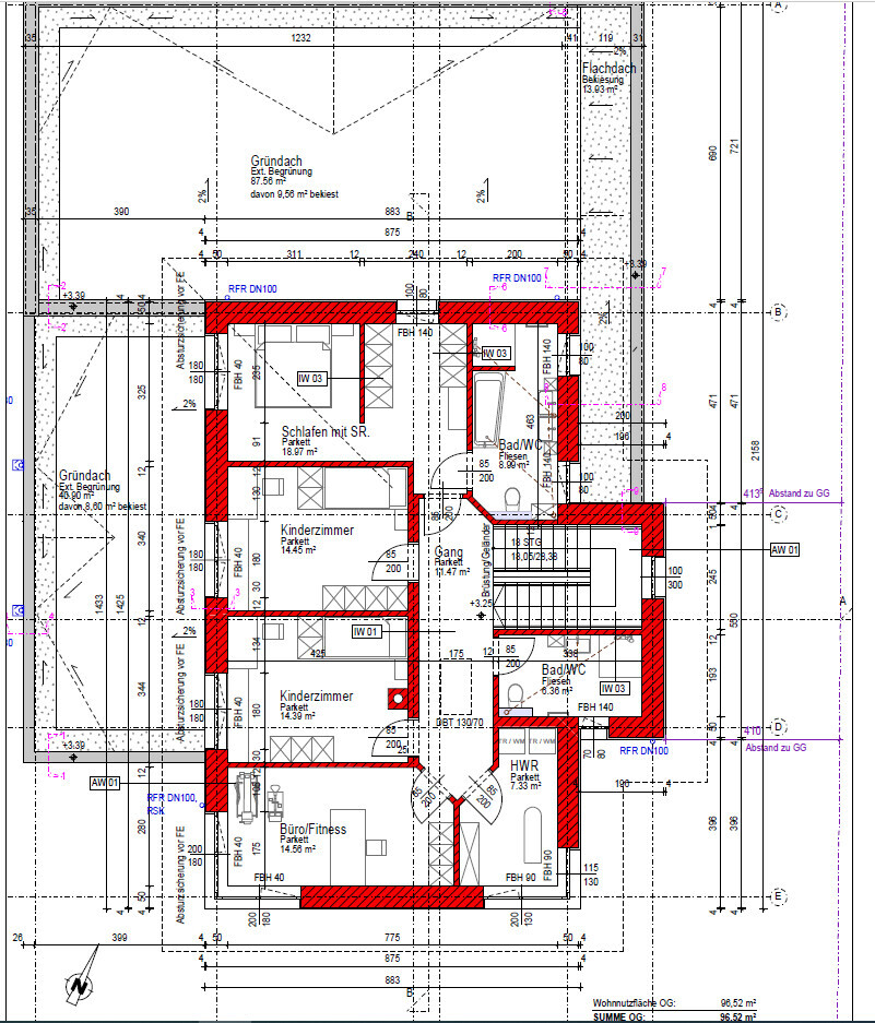 1: stimmt schon, ev. besser wie von ypg vorgeschlagen. Überlege aber noch ev. generell einen halben Meter Breite dazu zu geben um dann v.a. in den Bädern mehr Platz zu haben
