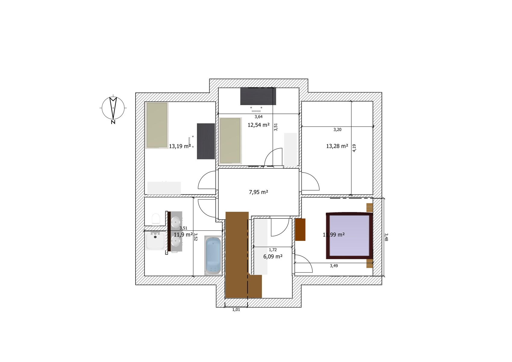 Die Nachteile des Grundrisses sollte man auch noch nennen: Der Treppenaufgang am Eingang birgt die Gefahr, dass man den Dreck ins OG schleppt. Außerdem ist im OG Flur kein natürliches Licht. Ersterem kann man mit einem sauberen Weg im Außengelände eindämmen, für das Licht im OG kann man ein schmales Fenster im Treppenflur setzen oder über Oberlichter bei den Zimmertüren nachdenken. Auch eine Frage der Optik.