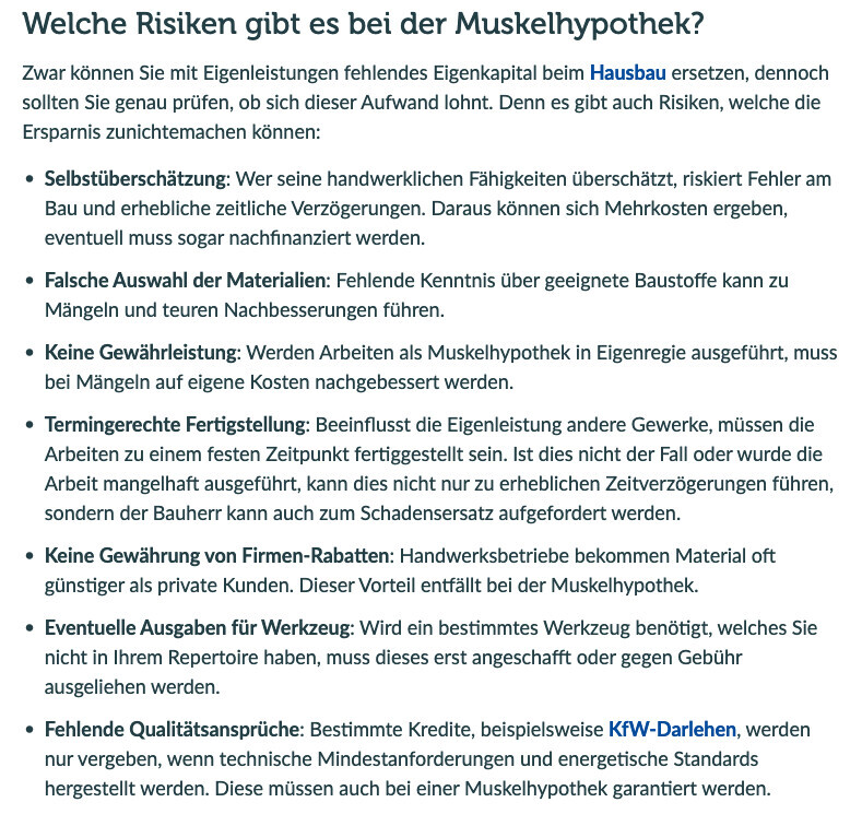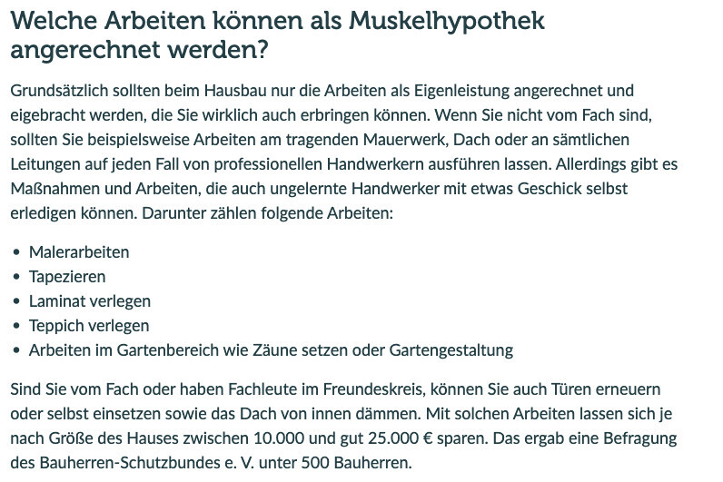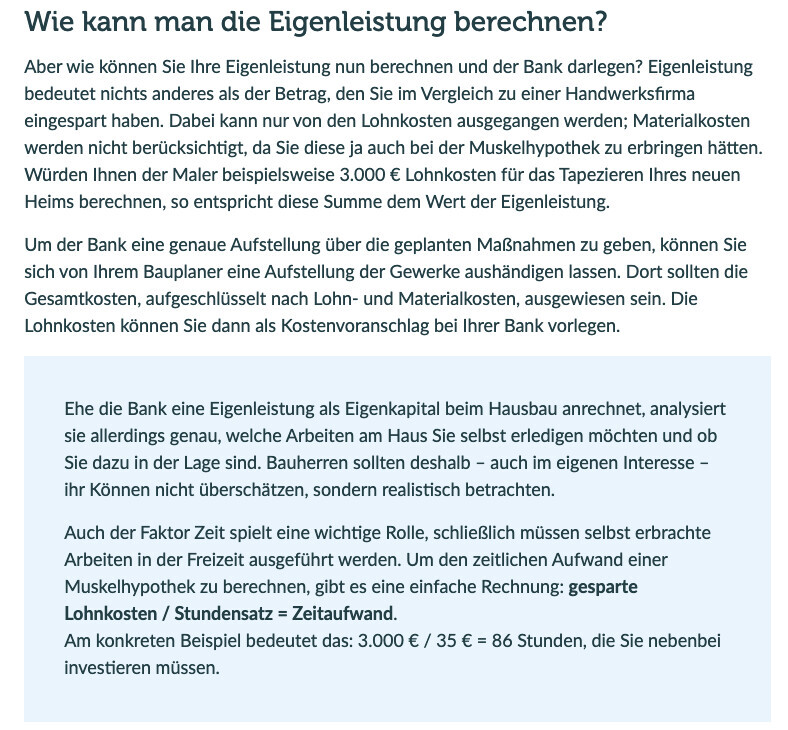Zum Thema grobe Überschlagung und Eigenleistungen: da will die Bank Zahlen haben, die nachvollziehbar sind und wo die Eigenleistungen in einem Rahmen auch machbar sind. Auch in einem zeitlichen Rahmen. Die wird weniger eine Langzeitbaustelle finanzieren als ein "schlüsselfertiges" Haus, wo man seine handwerklichen Kenntnisse auf die Malerarbeiten und Gartenanlage beschränkt.