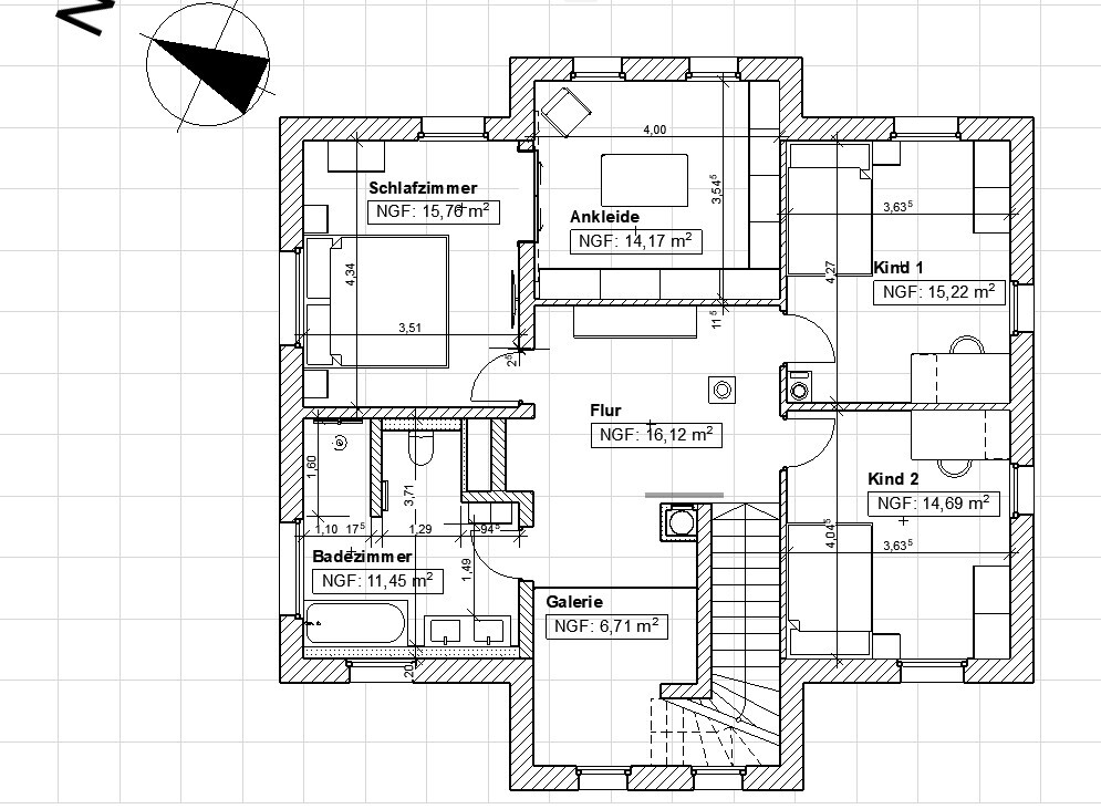 Nach Rücksprache mit dem Schornsteinfeger ist die Positionierung des Schornsteins (Schornstein mit separatem Luftzug) so nur schwer realisierbar (gem. Statik, BImSchV) und zudem kontraproduktiv für Solar. Stattdessen müsste der Schornstein, wie im Grundriss dargestellt (d. h. Schornstein ohne separatem Zug, vom Schornsteinfeger empfohlen), zum First verschoben werden. Hierdurch steht der Schornstein im OG mitten im Flur. Generell ist durch die Firstausrichtung und BImSchV die Positionierung des Schornsteins stark vorgegeben.