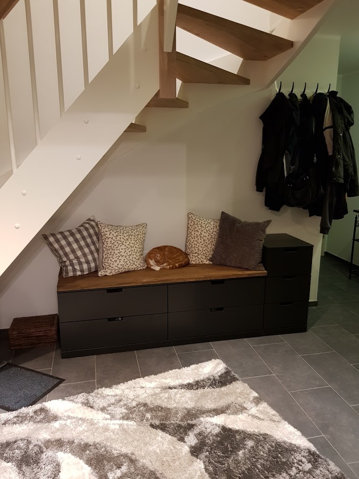 Der aktuelle Entwurf bietet immerhin die Möglichkeit den Platz unterhalb des zweiten Treppenlaufes zu nutzen. Hier sehe ich eine ausreichend Platz für eine große Schuhsammlung und vielleicht noch ein paar Jacken, die gerade keine Jahreszeit haben.