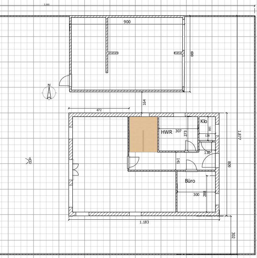 Anbei ein schneller Ausschnitt inkl. der Garage. Von Westen wäre es halt Platzmäßig entspannter. Wenn ich den Eingang oben hab, dann passt der Durchgang nach hinten nicht mehr wirklich. Unten kann passieren dass dort mal ein Stellplatz hinkommt, aber alles nicht sicher, deswegen nach vorne der Eingang.