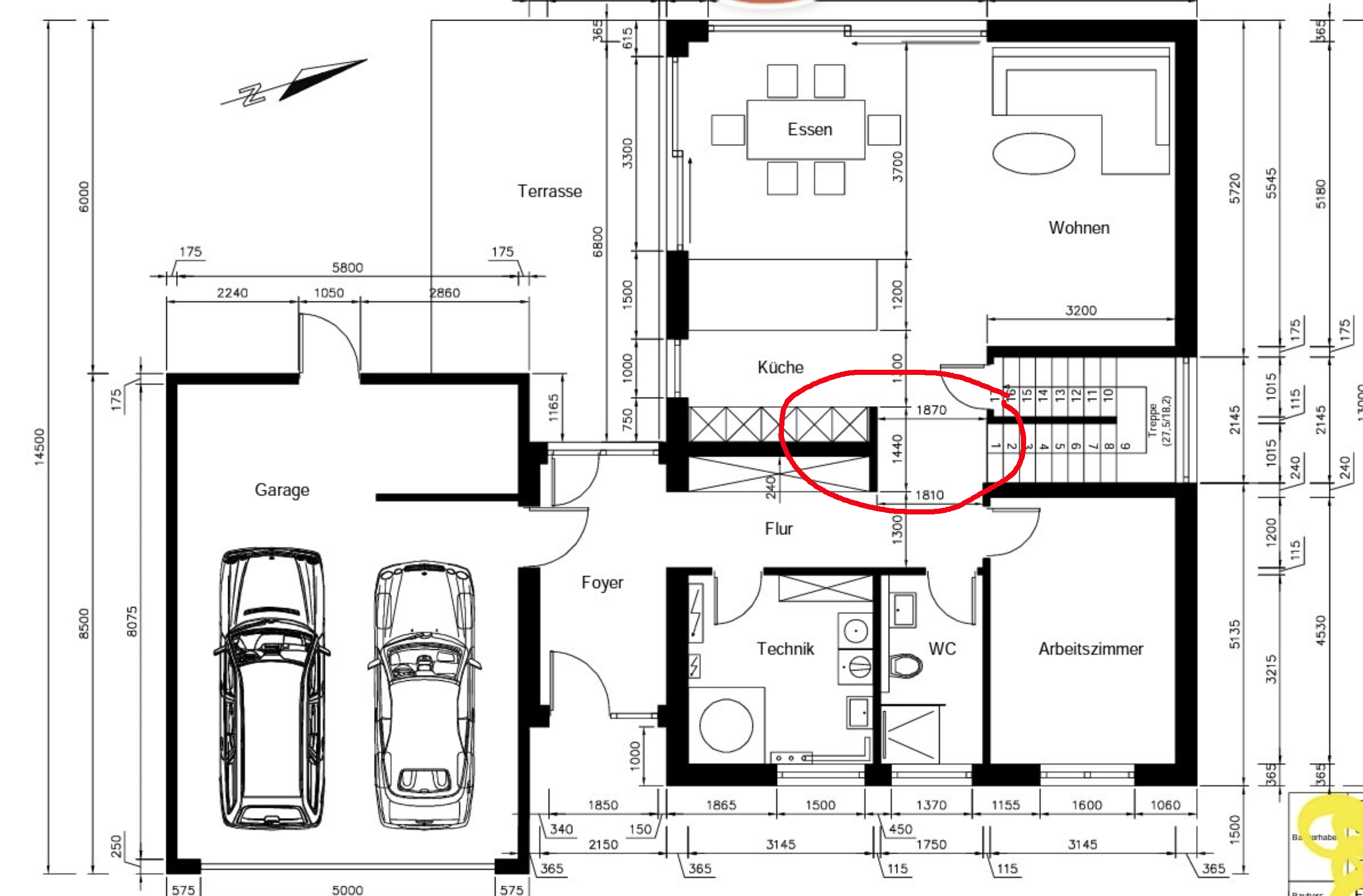 - den Wandstummel in der Garage könntet ihr auf die andere Seite verlegen und die Garagentür so weit nach planrechts verschieben, dass die Tür im Foyer entfallen könnte