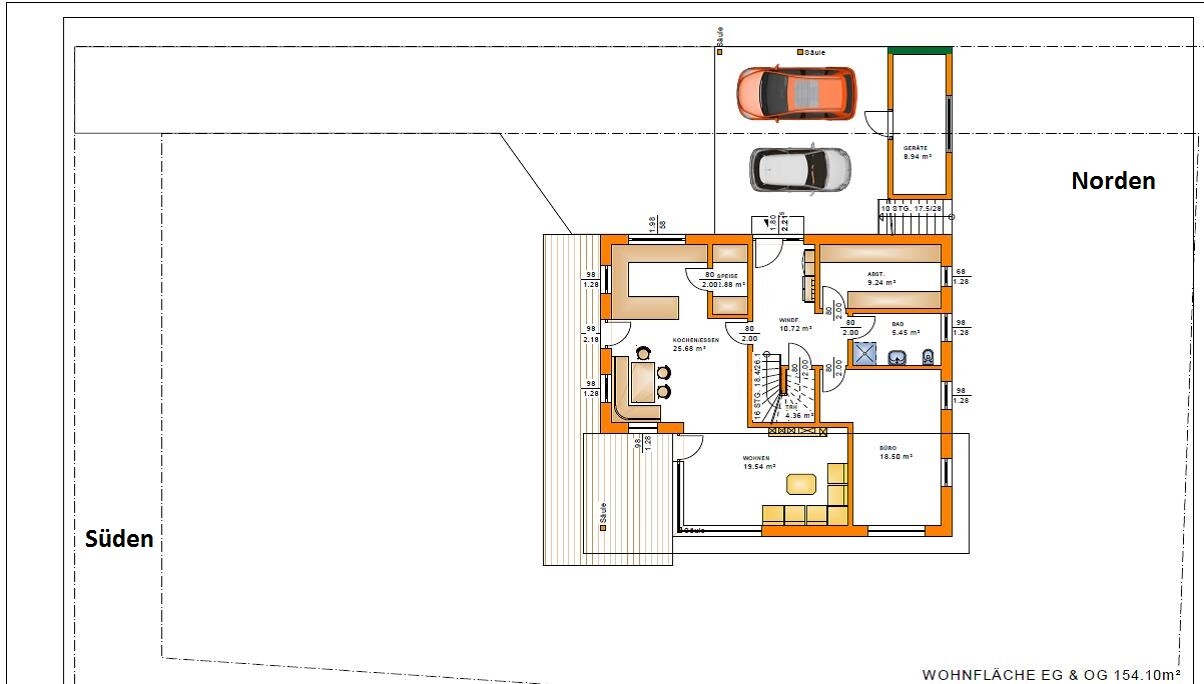 - Carport direkt vor der Hauseingangstür sieht alles recht eng aus. Warum den Carport nicht weiter Richtung Straße? Dann braucht man auch nicht so eine lange Einfahrt (pflastern, Schneeschieben etc.).