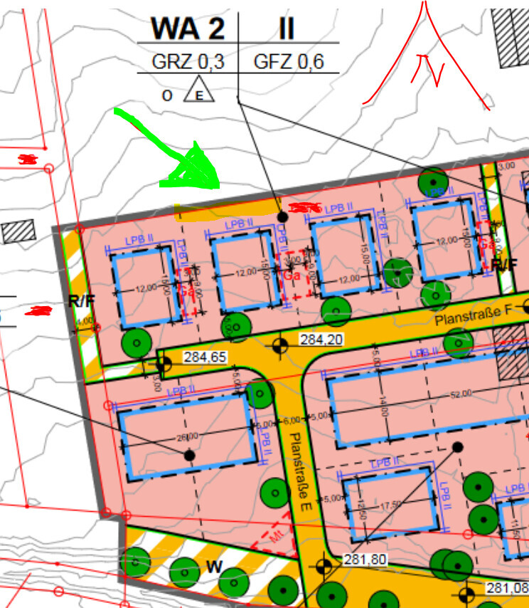 Hier ist nochmal die Lageskizze. Es ist keine Durchgangsstraße. Links 1 Nachbar, rechts kommen 3 Nachbarn. Alles ganz ruhig. Wir wollen unser Haus im Baufenster ganz unten und rechts 1 bis 1,5 Meter Platz zur Garage lassen. Am unteren Ende der Planstraße E ist keine Bebauung wegen einer geschützten Streuobstwiese.