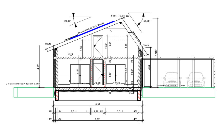 Garage, Carport – erstmal 2 Stellplätze im Carport geplant und zusätzliche freie Fläche, damit Kinder in Zukunft ihre Autos parken können