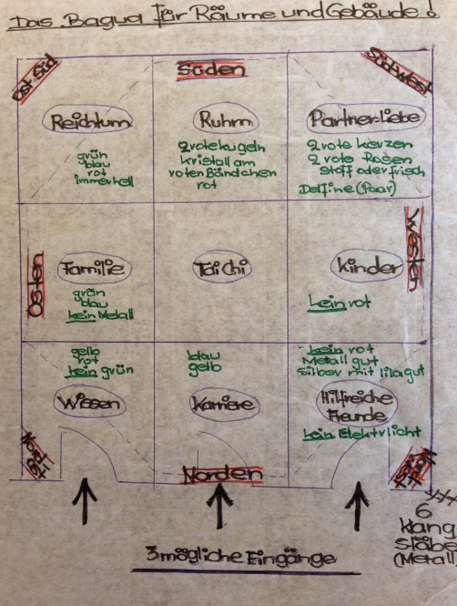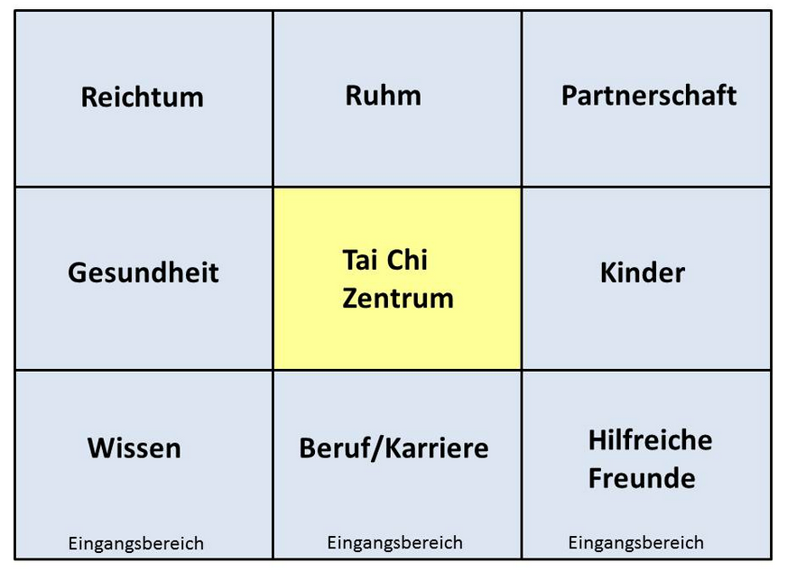 Das Bagua kann man auf Grundstücke, auf Ebenen und auf Zimmer ausrichten. Eingangsseite ist immer die Tür- oder Torseite.