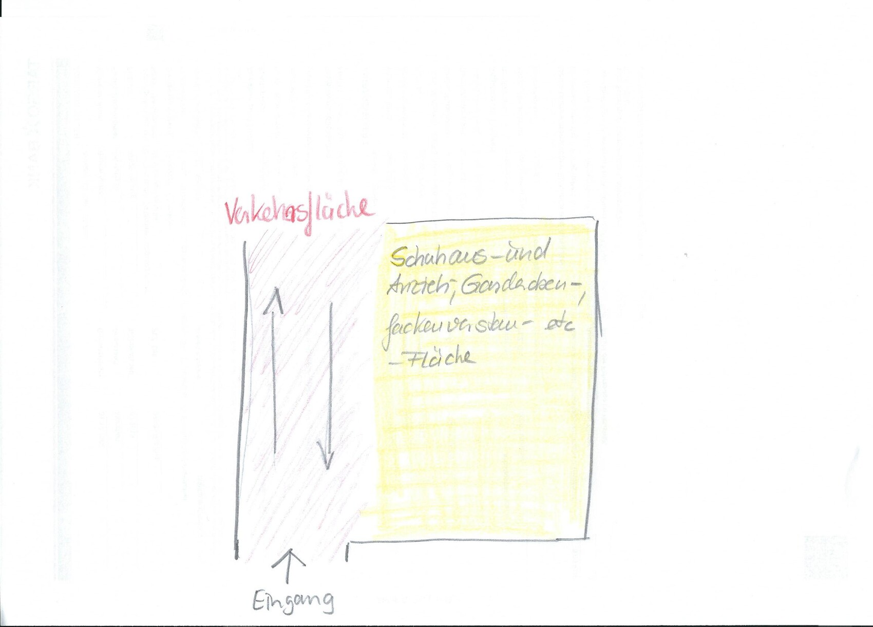 Grundriss-Skizze: linke Verkehrsfläche mit Pfeilen, rechts gelber Bereich, Eingang unten links.