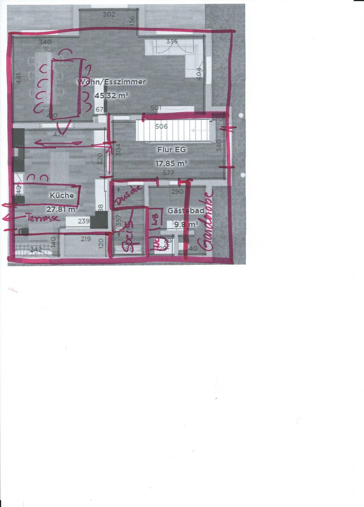 Speis ist aus der Küche weg, das Gäste-WC groß genug, hat aber zugunsten der Speis Platz her gegeben, Garderobe als offener Raum direkt an der Tür. Küche als Zweizeiler, dazwischen Tür in den Garten zur Terrasse. Ich hab's jetzt nicht im Kopf, wie euer Haus auf den Grundstück platziert ist. Ggf. würde ich Küche und Wohnzimmer tauschen, damit die Küche zur Terrasse wandert. Wer will kann ein paar Stühle an die Arbeitsplatte der Insel stellen, würde aber keine Barlösung machen, das geht von der Arbeitsfläche auf der Insel ab. Einfach ein paar Unterschränke nach vorne zum Essbereich aussparen, wenn man den Stauraum nicht braucht und da Stühle in der richtigen Höhe hin. Dann eine Schiebetür zum Essbereich, da gewünscht (ich würde sie weglassen). Und dann merkst du schon, daß da plötzlich gut ein Meter mehr Raum ist... das Haus könnte also kleiner ohne daß man einen Verlust an Platz wäre.