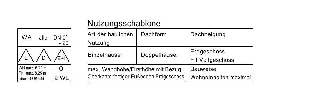 Skizze einer Nutzungsschablone für Baugrundrisse, Dachform und Fußbodenhöhe.