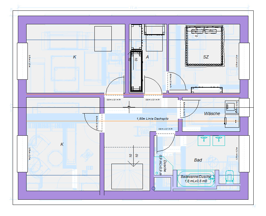 Platz für eine dauerhafte Treppe in den Dachspitz zu opfern, fände ich raus geschmissenes Geld. Ich habe mal die 1,80m Linie eingezeichnet (2m wär noch schmaler) - ich hoffe, ich hab mich nicht verrechnet. Dann bitte korrigieren. Aber dieser Streifen lohnt wirklich nicht, dass man sich da regelmäßig hin begeben wöllte. Macht niemand. Nomaler Lukenzugang reicht für die Kidis auch. Dann können sie da oben die Eisenbahn aufbauen, neben den Weihnachtskugeln. Aber sonst ist es das m.E. nicht wert.