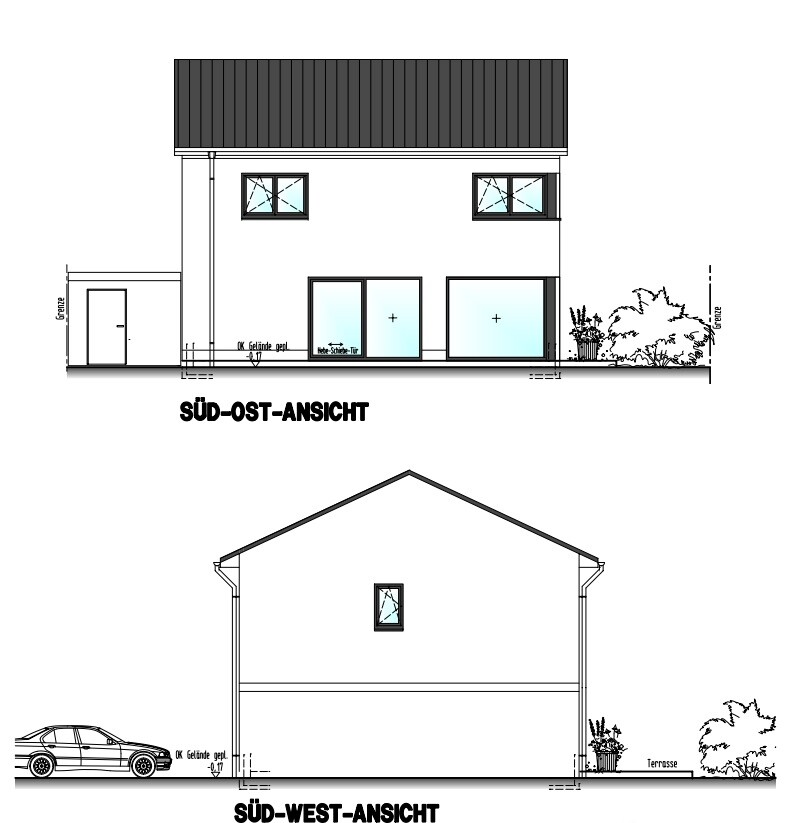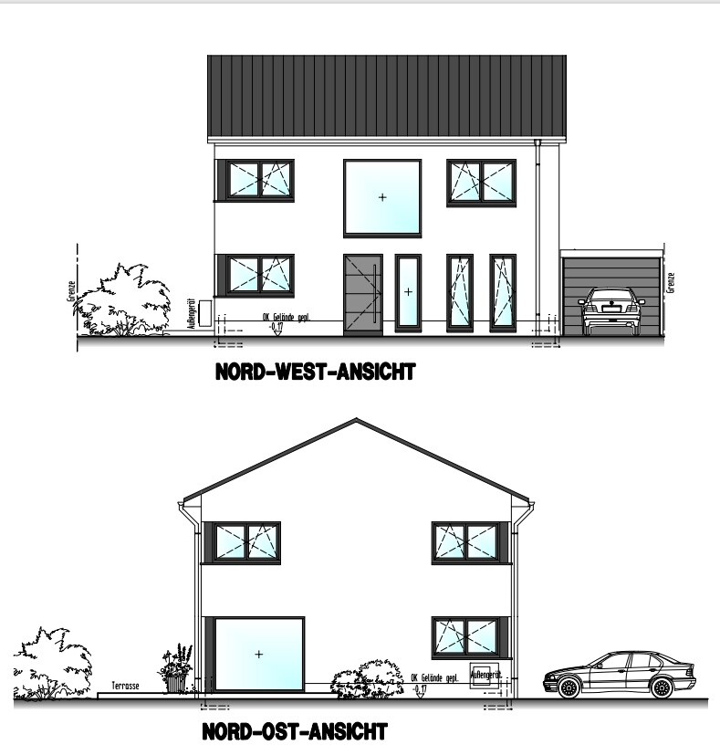 Die Fenster am Eingang werden noch angepasst. Das Bodentiefe neben der Eingangstür entfällt, die beiden vom Gäste-WC und Hauswirtschaftsraum werden länglich aber nicht Bodentief.