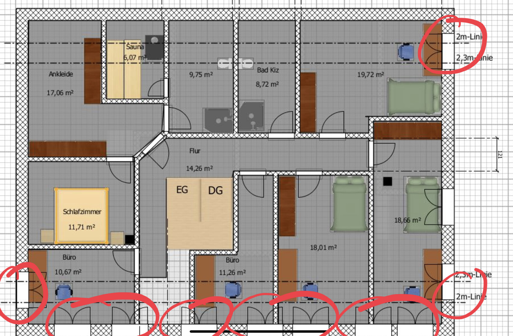 Danke, das ist der vierte Fehler in meinem Entwurf,der fünfte: Fenster! Fenster im OG Traufseite (davon gehe ich aus, deshalb meine Vermutung der 2-Geschossigkeit und Unterstellung, dass da was falsch ist) …und Fenster im Giebel seitlich. Stehen die bei Dir auf dem Boden? Du wirst so nicht annähernd eins dieser Fenster bauen können und dürfen (Brüstungssicherung 90cm).. Gauben wiederum erhöhen wiederum die erlaubten 2/3 negativ.Ich zeige Dir mal, wo es mit Brüstung und oberer Linie Probleme gibt