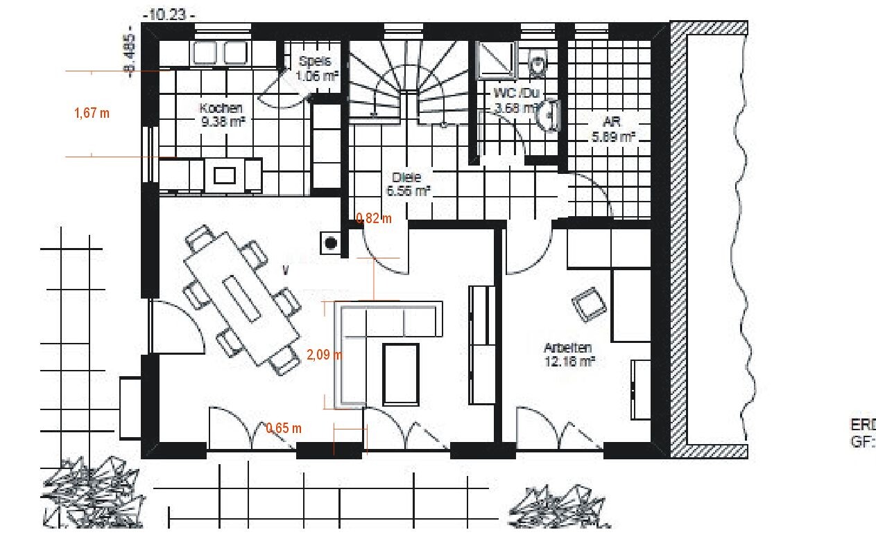 Ja, unser größter Stein des Anstoßes ist das relativ kleine Wohnzimmer. Hinzu kommt, dass dort eine Terrassentür und drei bodentiefe große Fenster sind. Wir können also unsere Möbel kaum an eine Wand stellen, wodurch wir uns das relativ kleine Zimmer noch zusätzlich voll stellen. Auf der anderen Seite des Zimmers soll am Kamin noch ein Ofen stehen, vor dem man auch Abstand braucht, so dass auch dort das Zimmer enger wird als gedacht. Als Lösung sehen wir evtl. die Verbreiterung des Hauses (was wir uns wahrscheinlich nicht leisen können werden) oder das Auswechseln der großen bodentiefen Fenster in kleinere, unter die man auch ein Sideboard oder eine Couch stellen kann. Und vielleicht lässt sich ja auch das Arbeitszimmer noch verkleinern (wir brauchen ein ordentliches Arbeitszimmer, weil meine Frau viel von zu Hause arbeiten wird - die Anregung mit der Schiebetür finden wir aber sehr hilfreich).Sivolefe schrieb: