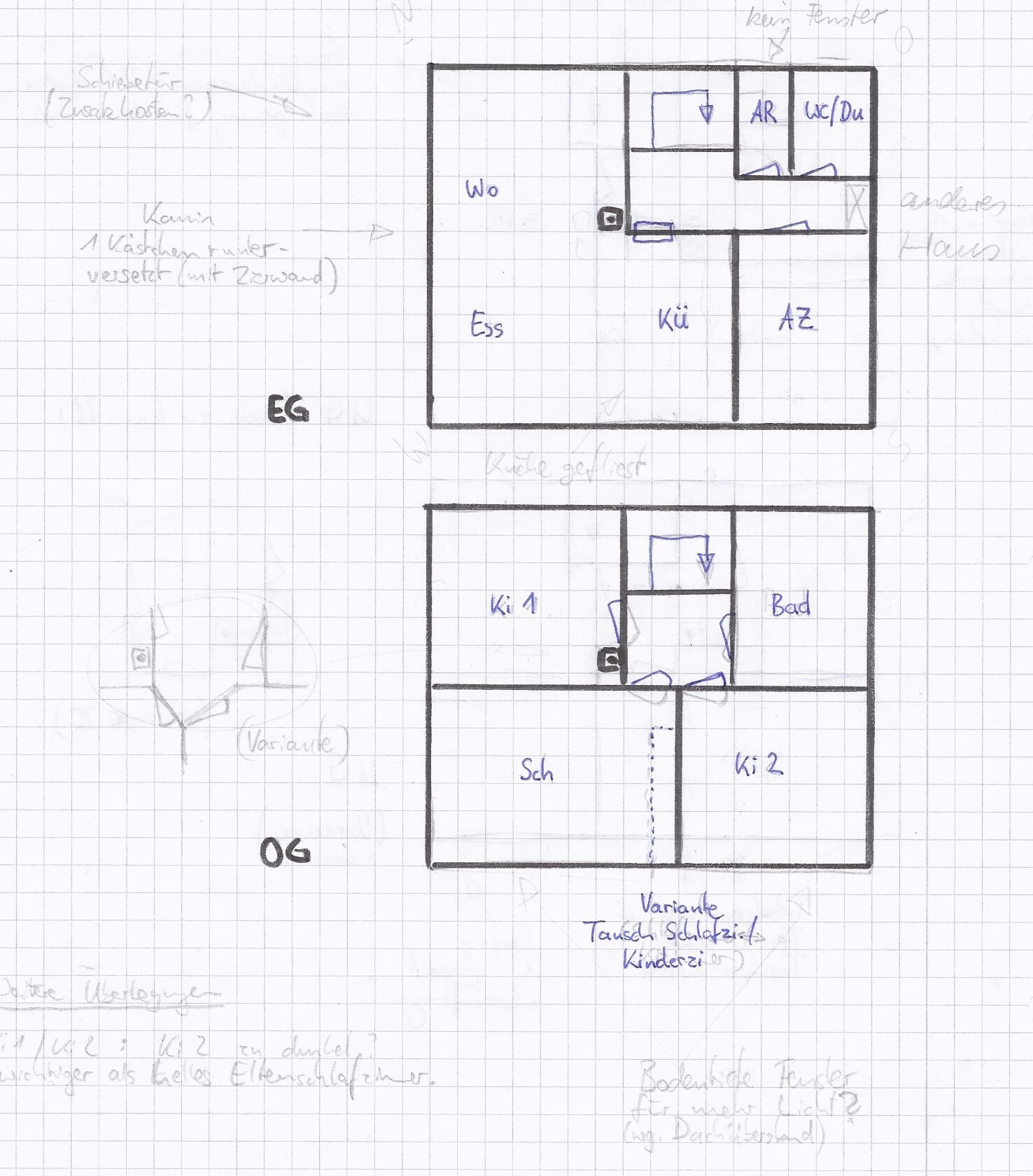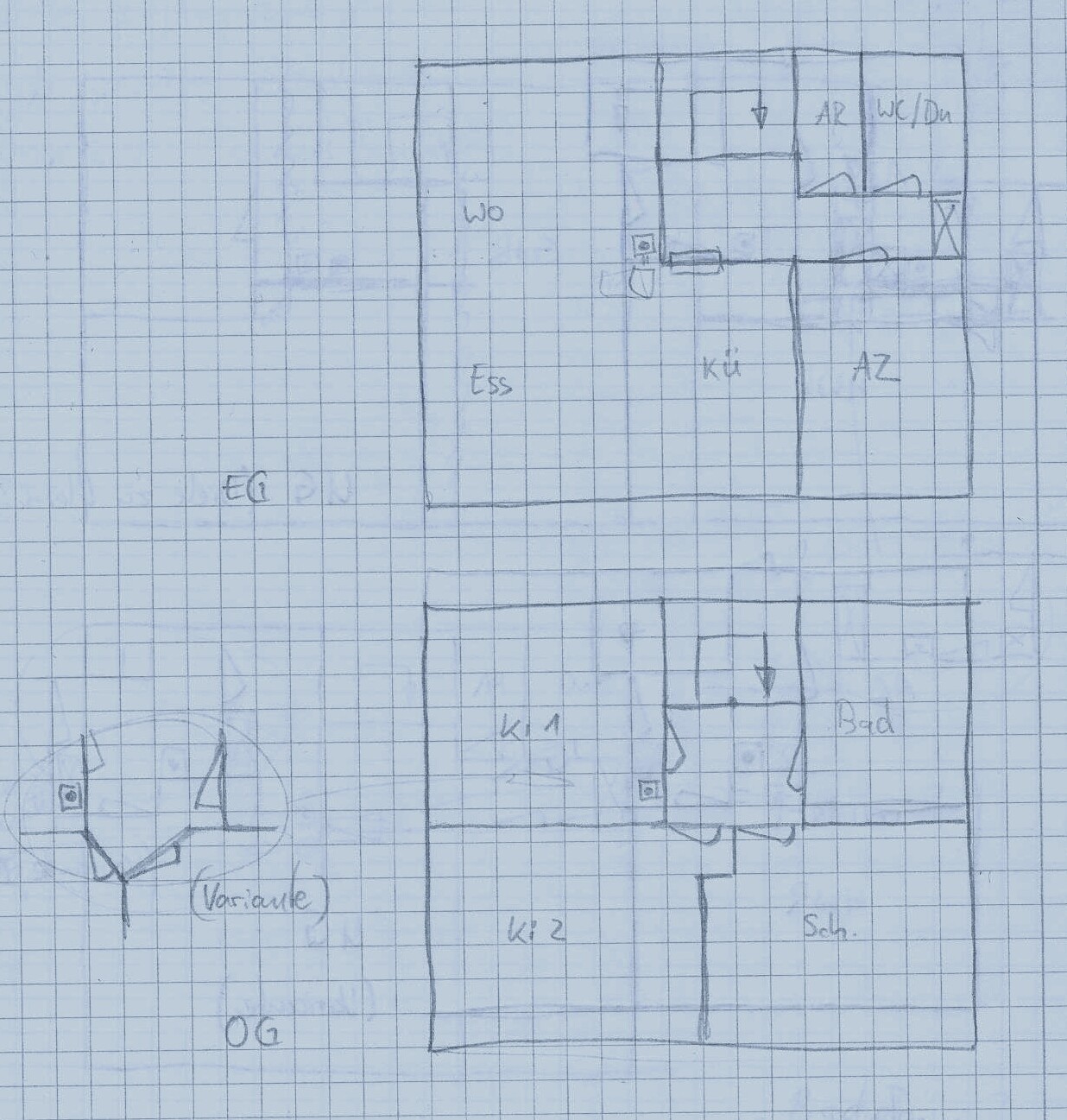 Etwas bessere Scans des Grundrisses. Vertauscht haben wir in der Zwischenzeit im OG das Kinderzimmer mit dem Schlafzimmer, dadurch wird die Wand wieder grade.