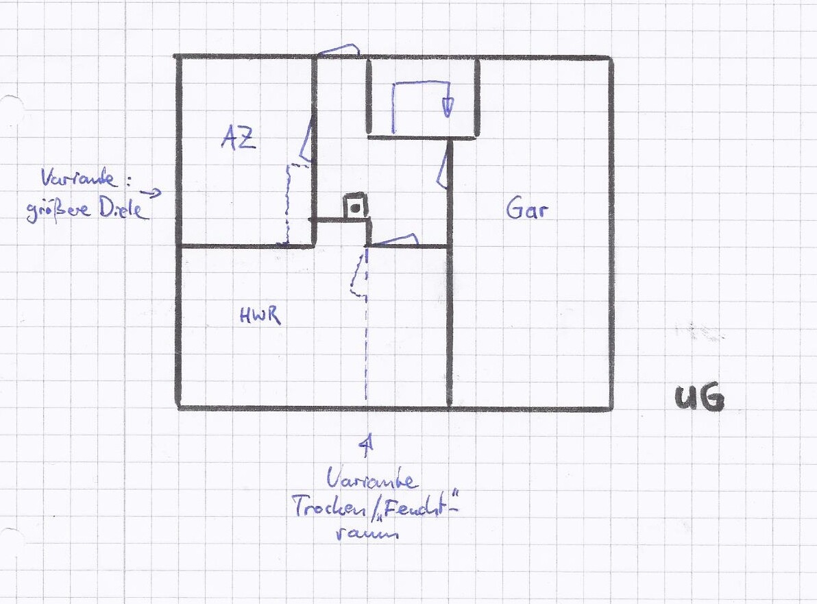 Im UG wird das das Arbeitszimmer größer, zu Lasten der Garage, die aber nur im Bereich der Einfahrt enger wird. Problem ist der Kamin für den Schwedenofen, der die Diele/Eingangsbereich sehr klein macht. Deshalb hab ich mir da Varianten überlegt, welche jeweils Nischen in die Graden Wände ziehen.