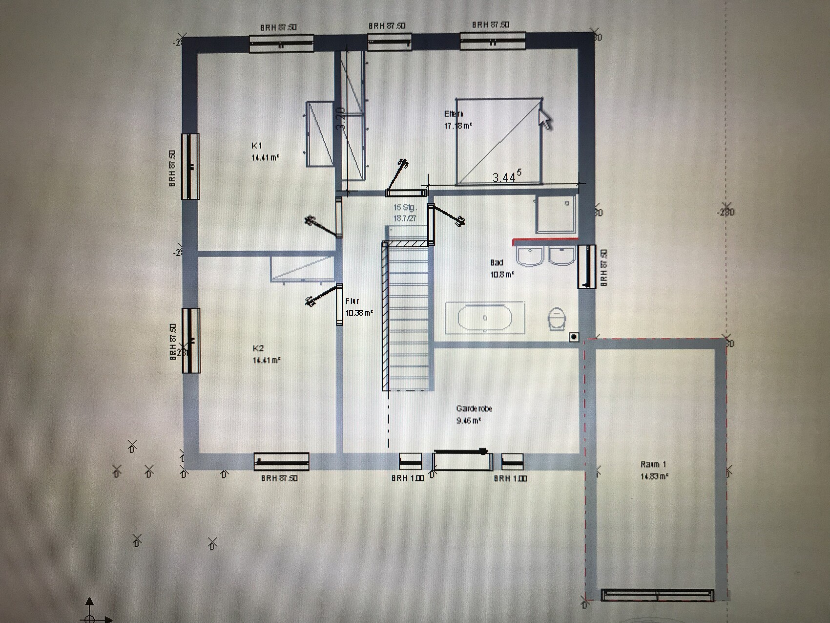 Ich befürchte, dass sich das Vorziehen der Garage (bzw. Haus nach hinten) sich bei den Baukosten deutlich bemerkbar macht. Aber das klär ich noch mal ab. So bekommt man auf jeden Fall mehr Möglichkeiten, weil ein Fenster in dem Raum an der Garage möglich wird.