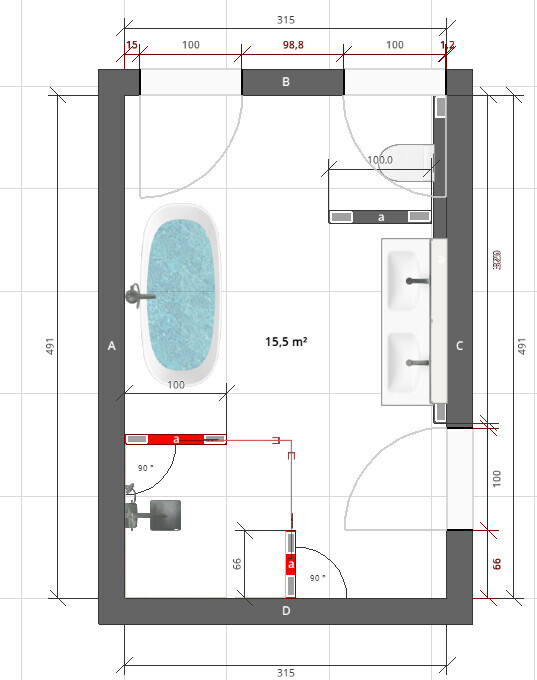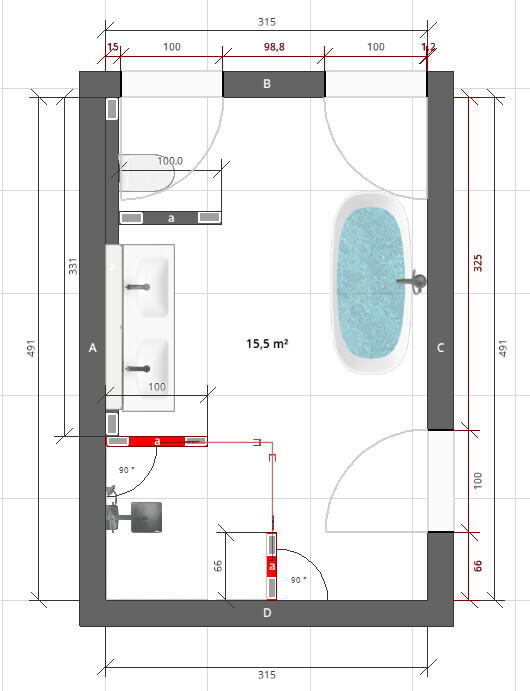 Du solltest Dir zudem angewöhnen, die Vorsatzwände mit einzuzeichnenDie sind nicht immer nötig. Umd eigentlich auch eingezeichnet an den relevanten Stellen.Bei den Badvisionen aus Beitrag 20 ..