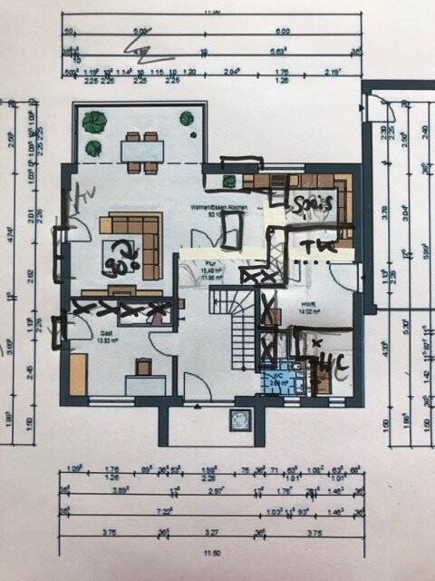 Ich habe leider vergessen zu erwähnen, dass die eingezeichneten Möbel/Küche so nicht von uns geplant sind. Sofa soll wie von dir vorgeschlagen, gestellt werden.